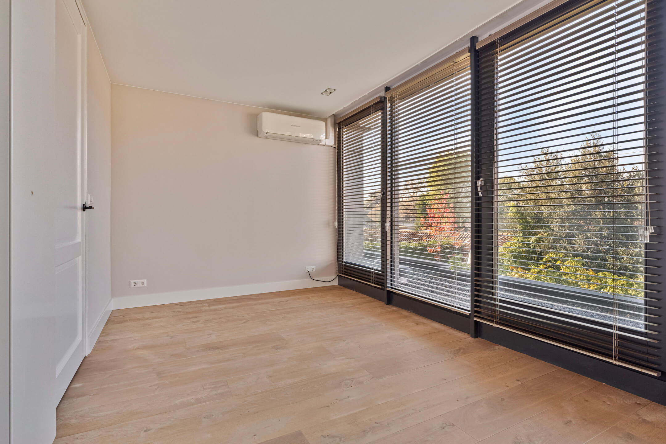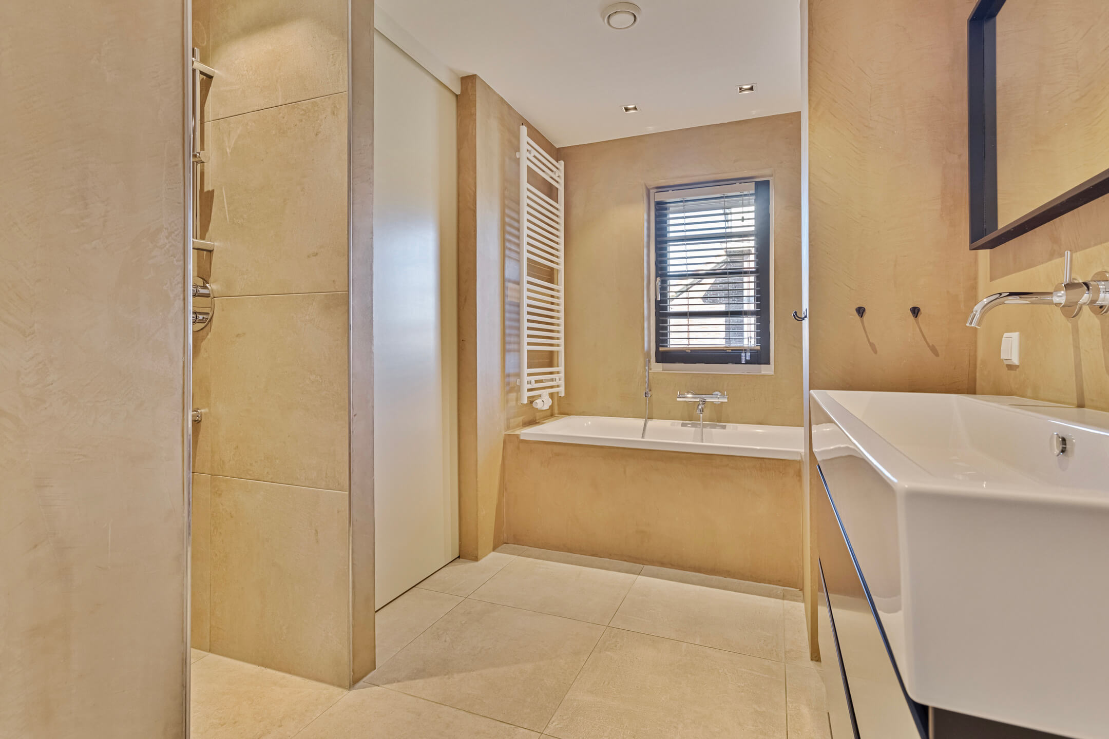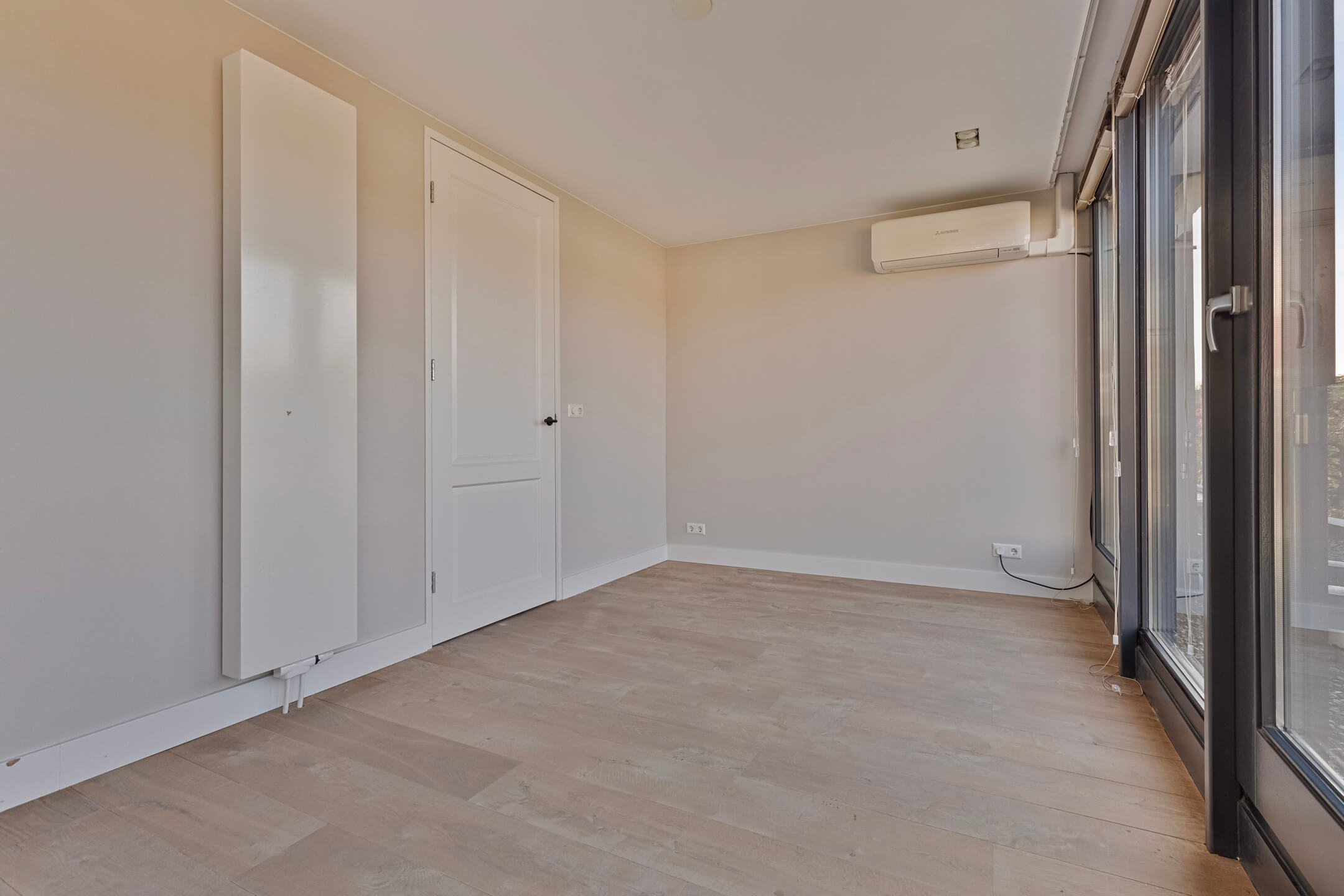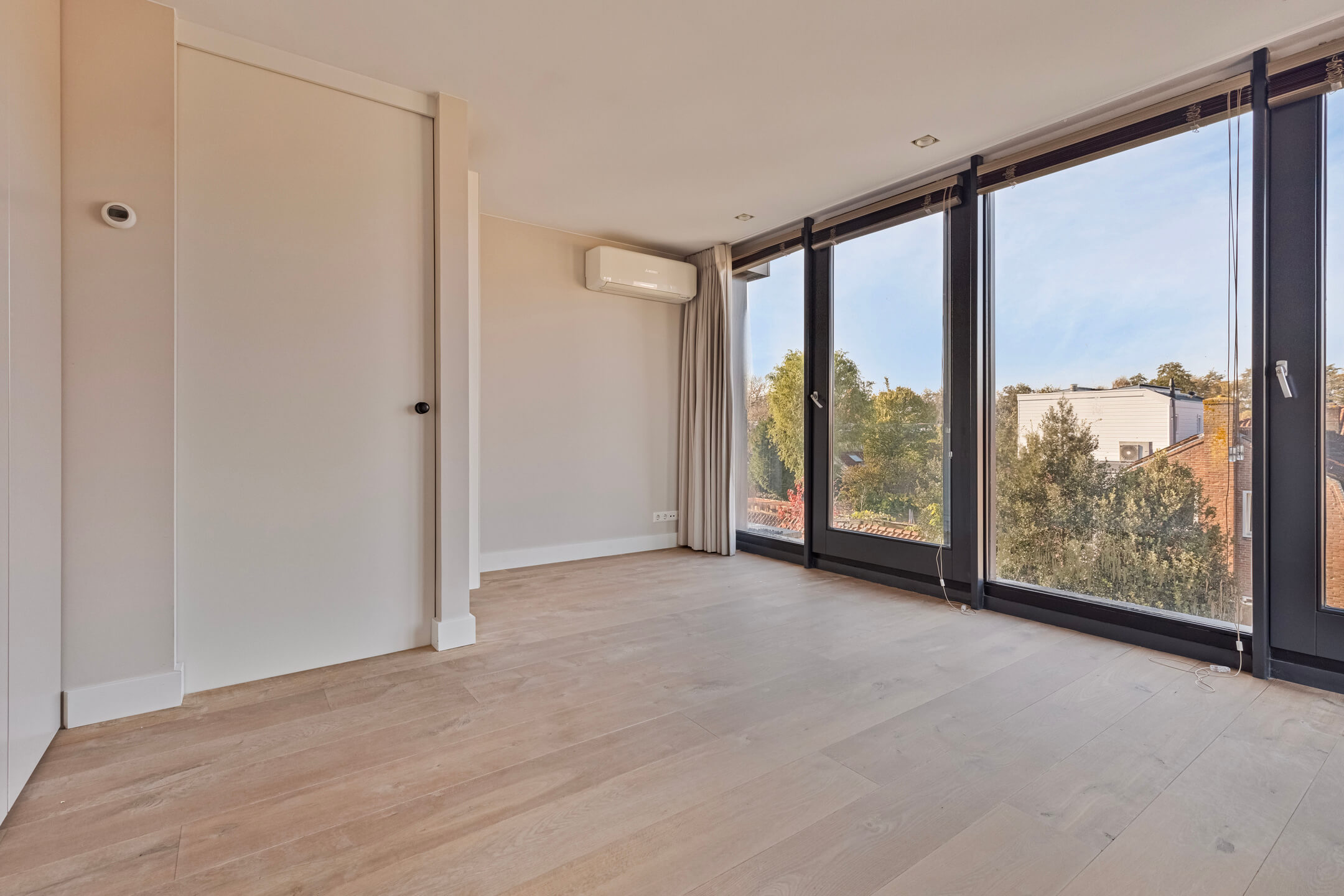 De bovenste verdieping biedt een ruime slaapkamer met inbouwkasten, airconditioning en een eigen badkamer met vloerverwarming, inloopdouche en toilet. Deze ruimte kan ook goed worden ingericht als kantoor of speelruimte.
