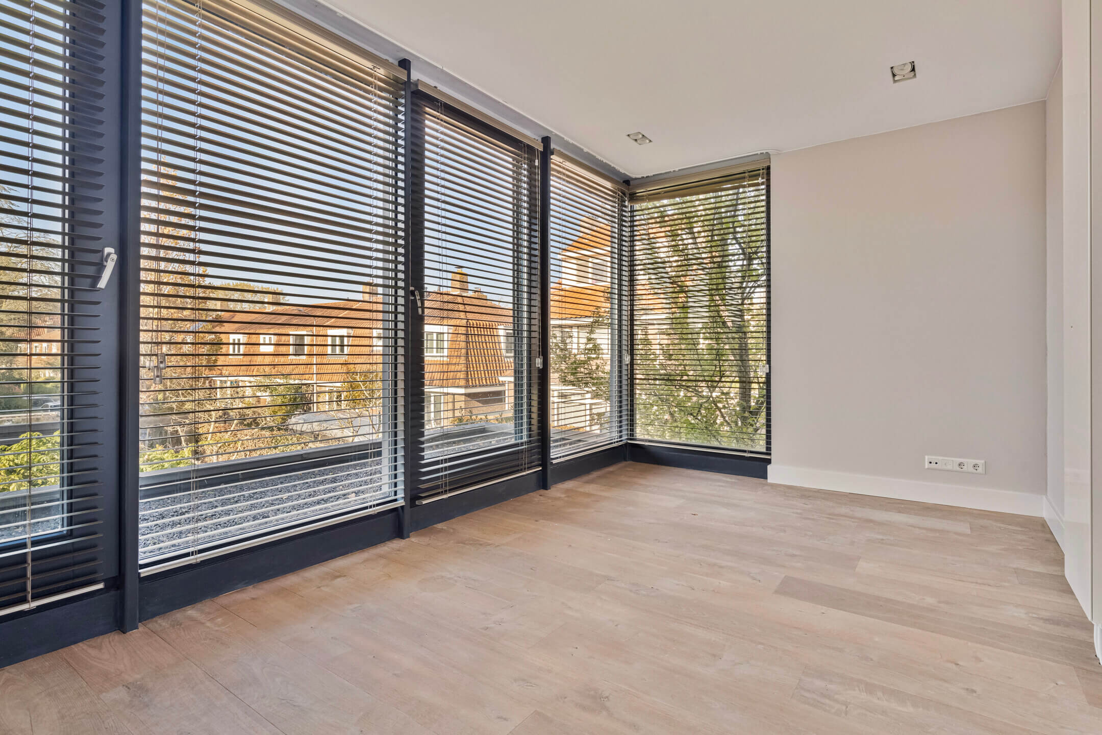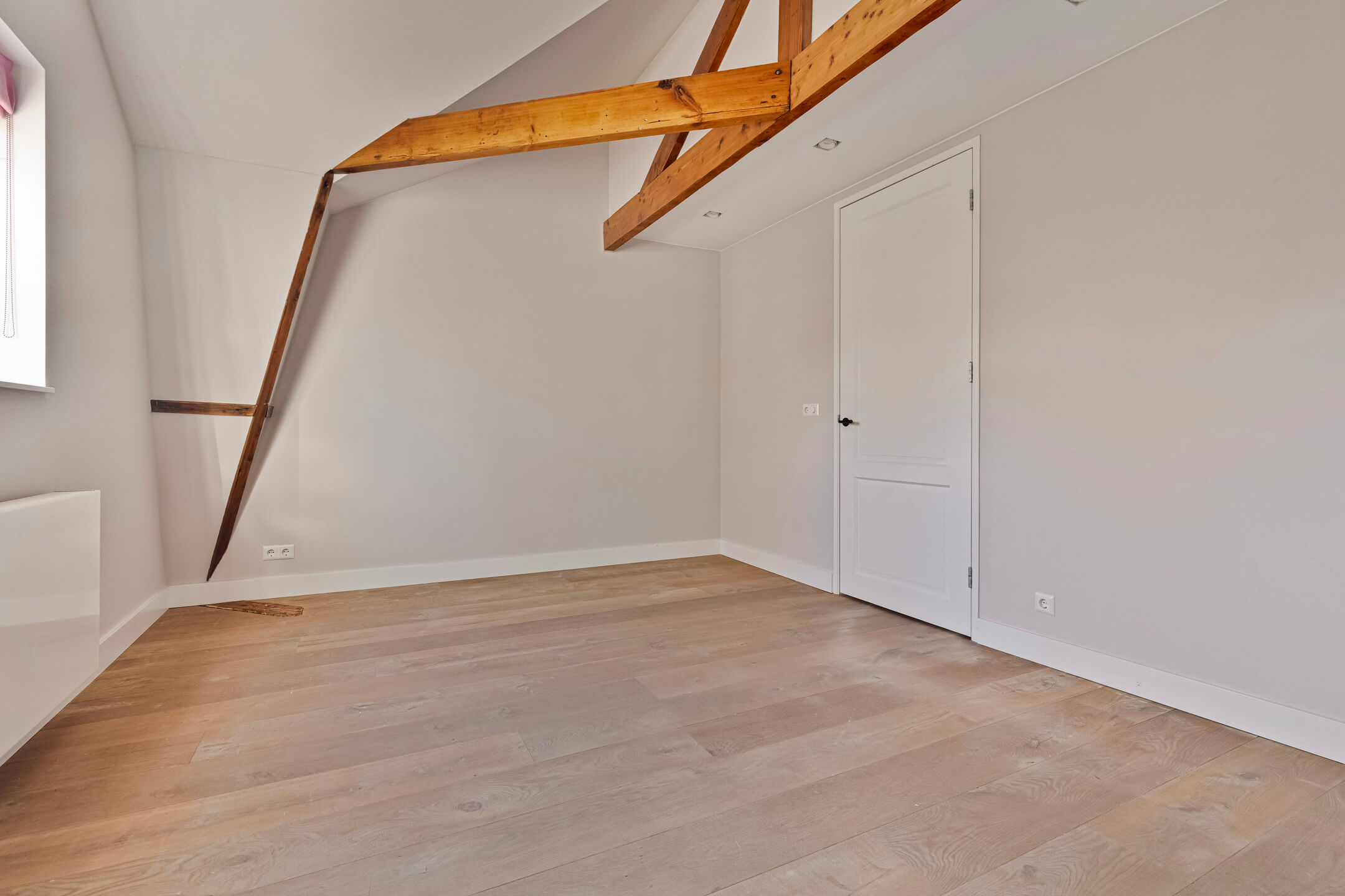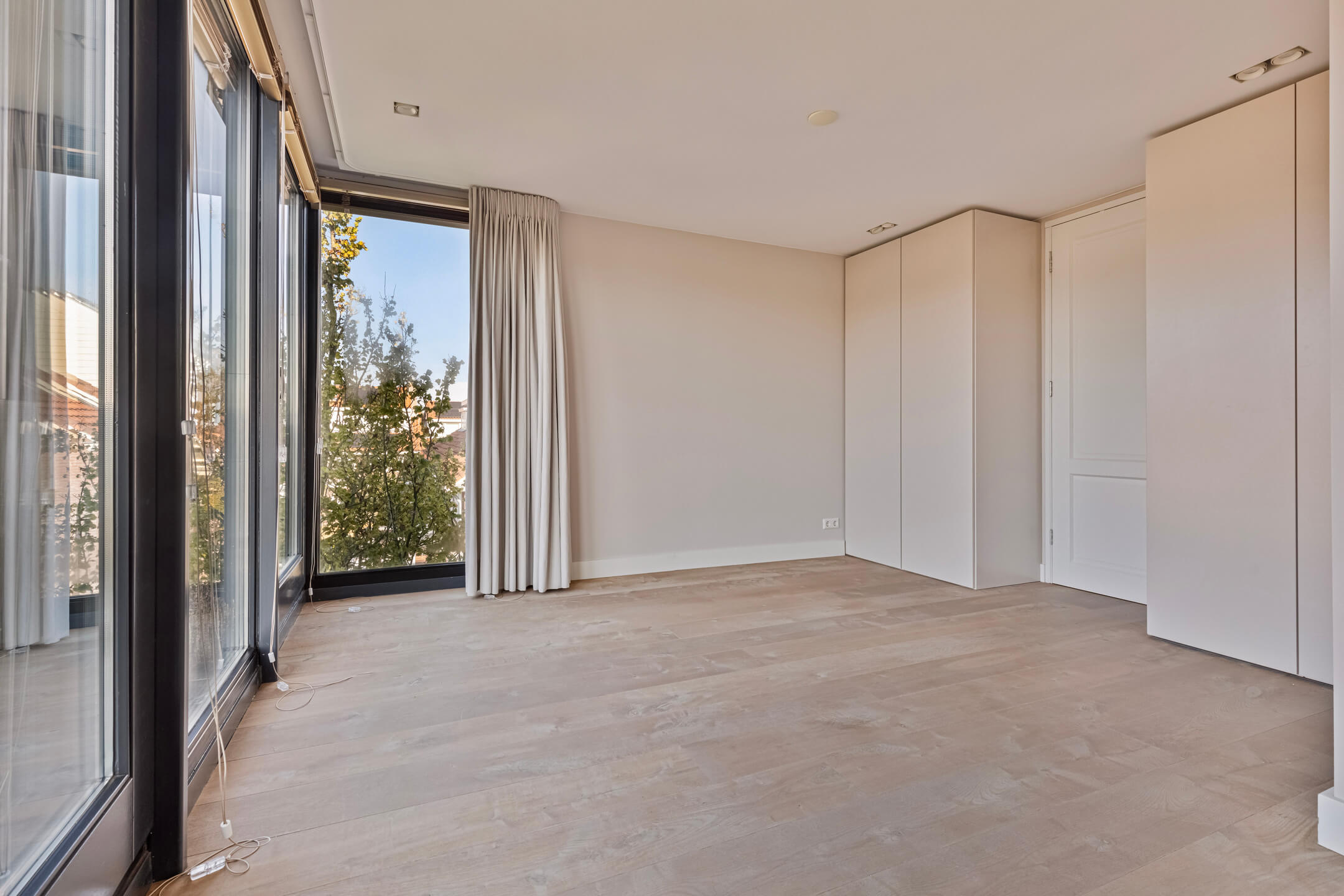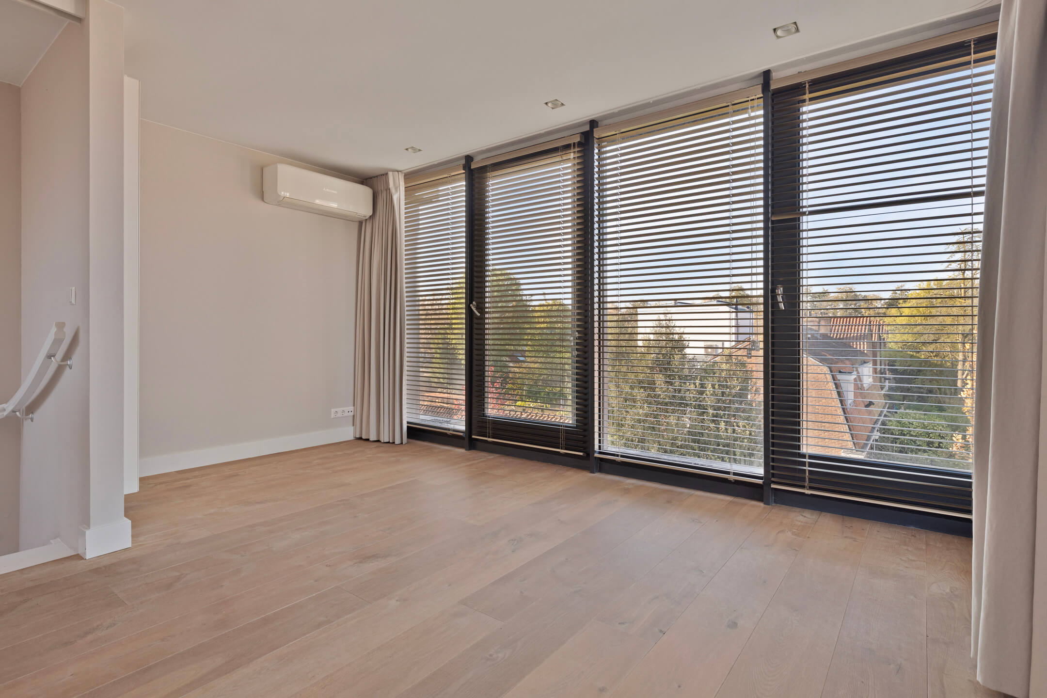 De bovenste verdieping biedt een ruime slaapkamer met inbouwkasten, airconditioning en een eigen badkamer met vloerverwarming, inloopdouche en toilet. Deze ruimte kan ook goed worden ingericht als kantoor of speelruimte.