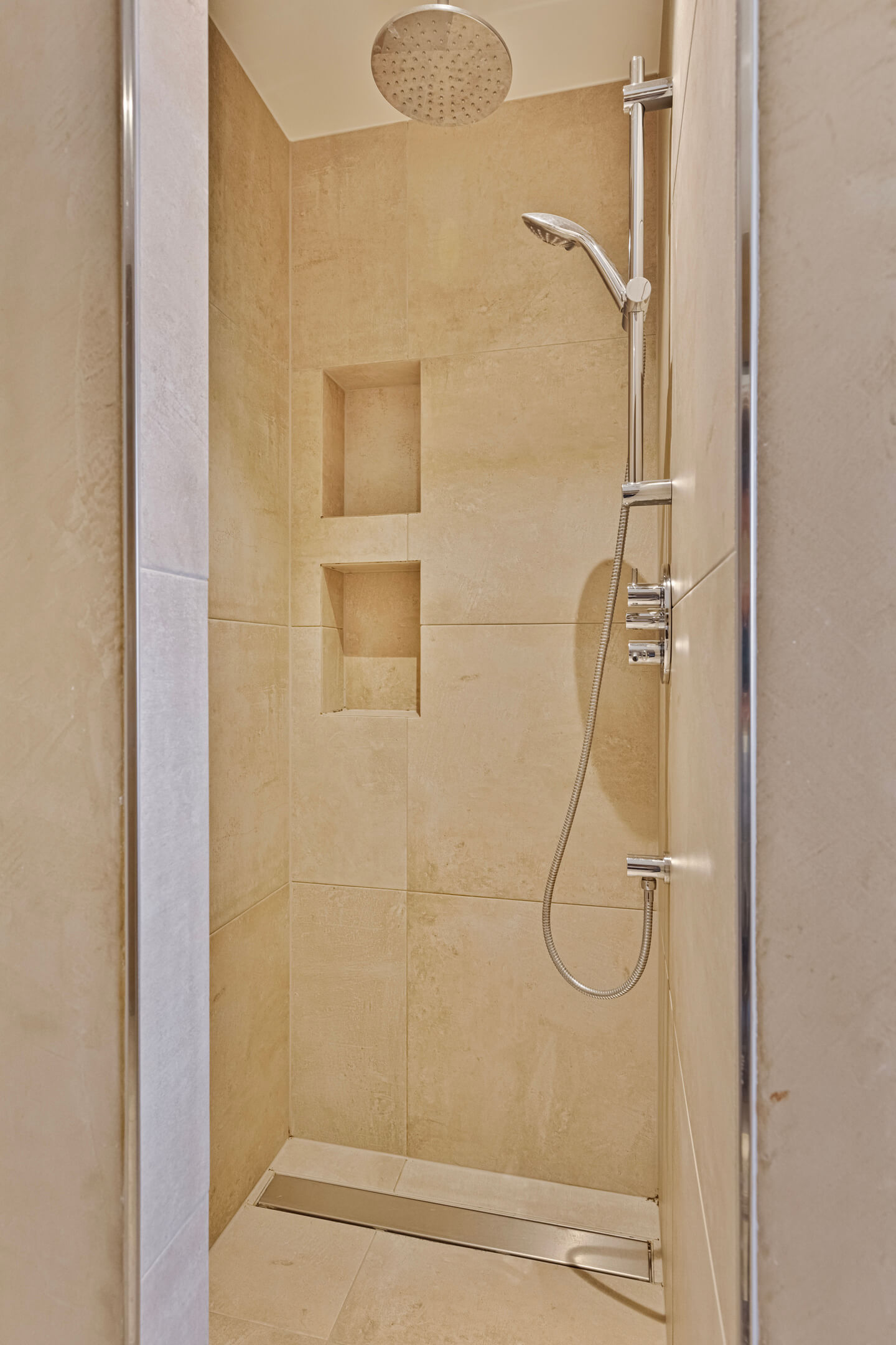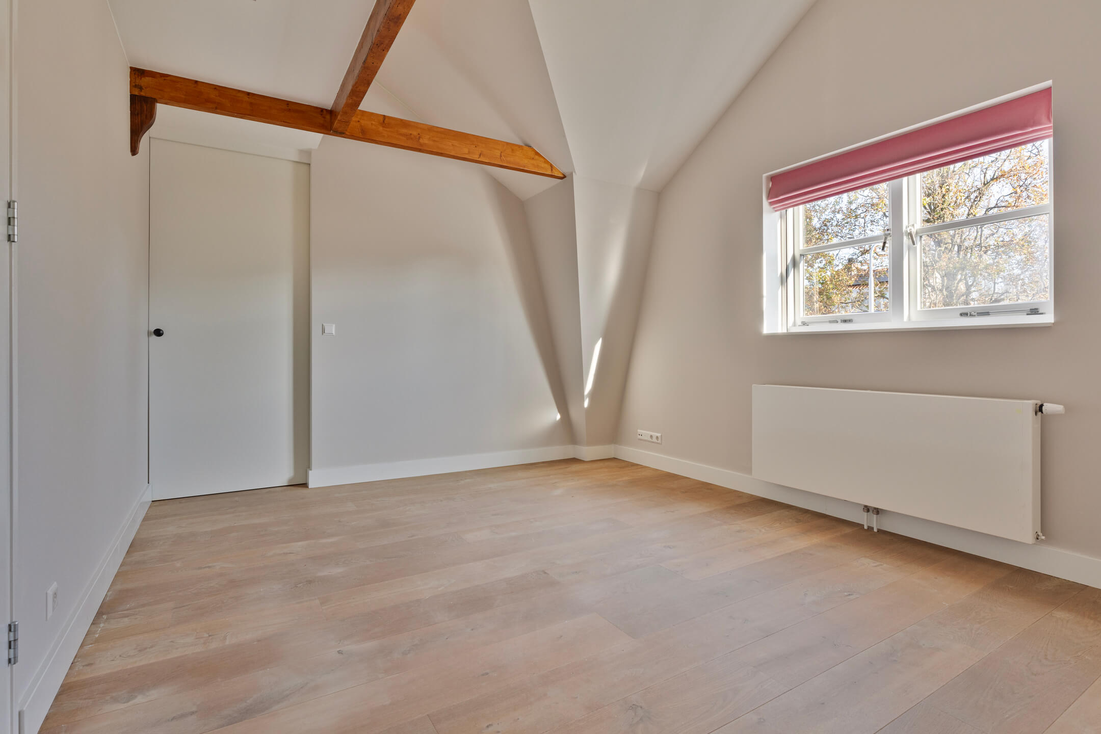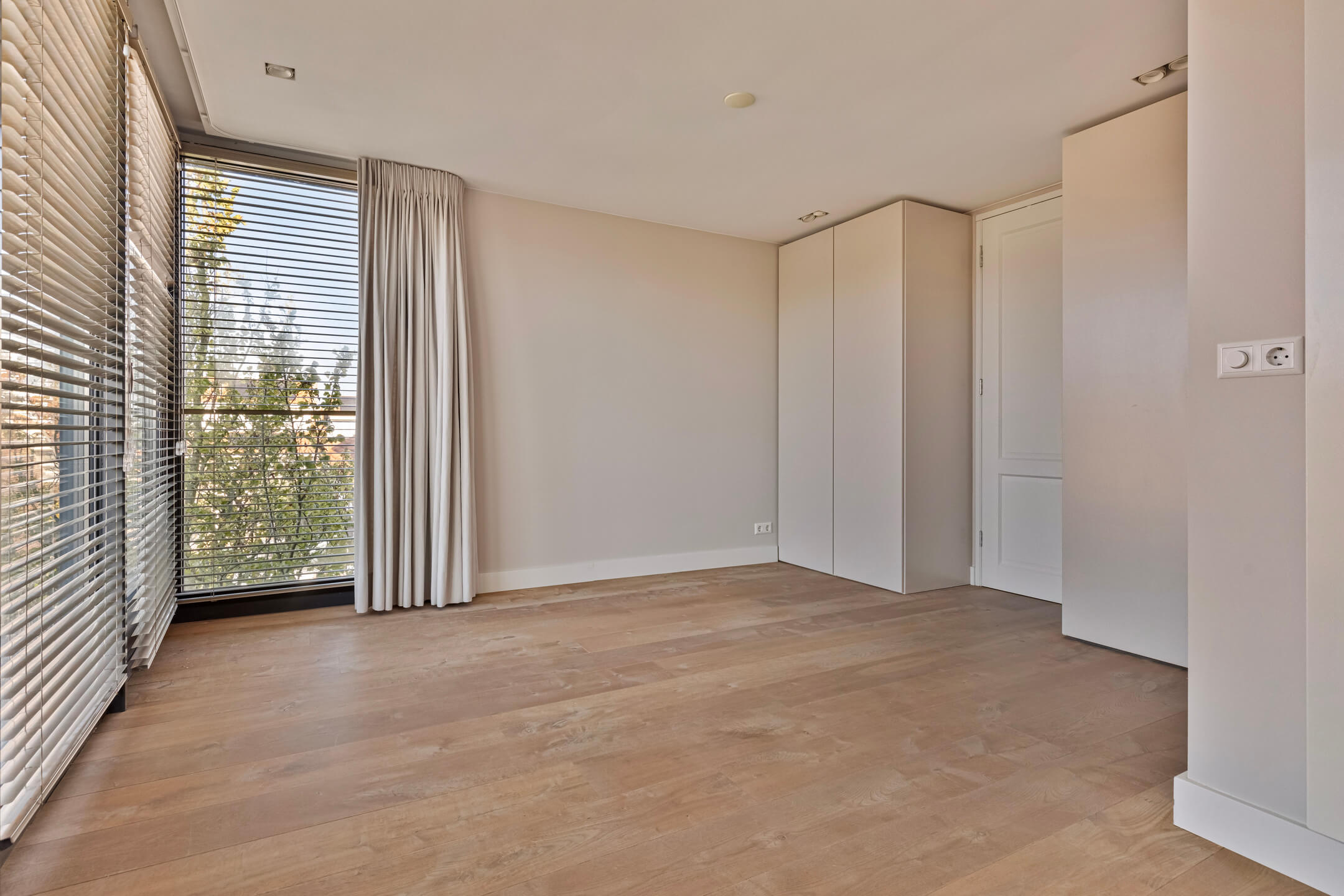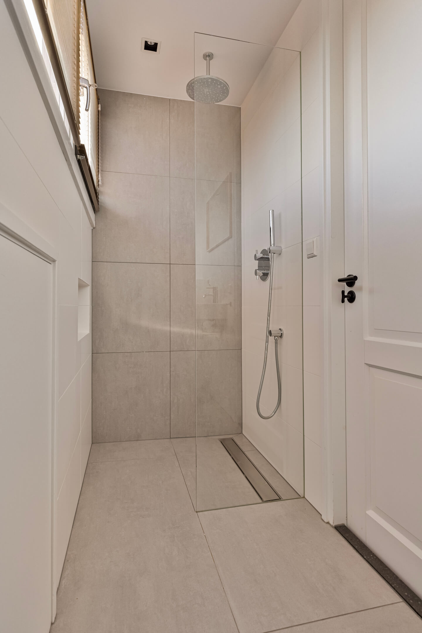 De bovenste verdieping biedt een ruime slaapkamer met inbouwkasten, airconditioning en een eigen badkamer met vloerverwarming, inloopdouche en toilet. Deze ruimte kan ook goed worden ingericht als kantoor of speelruimte.