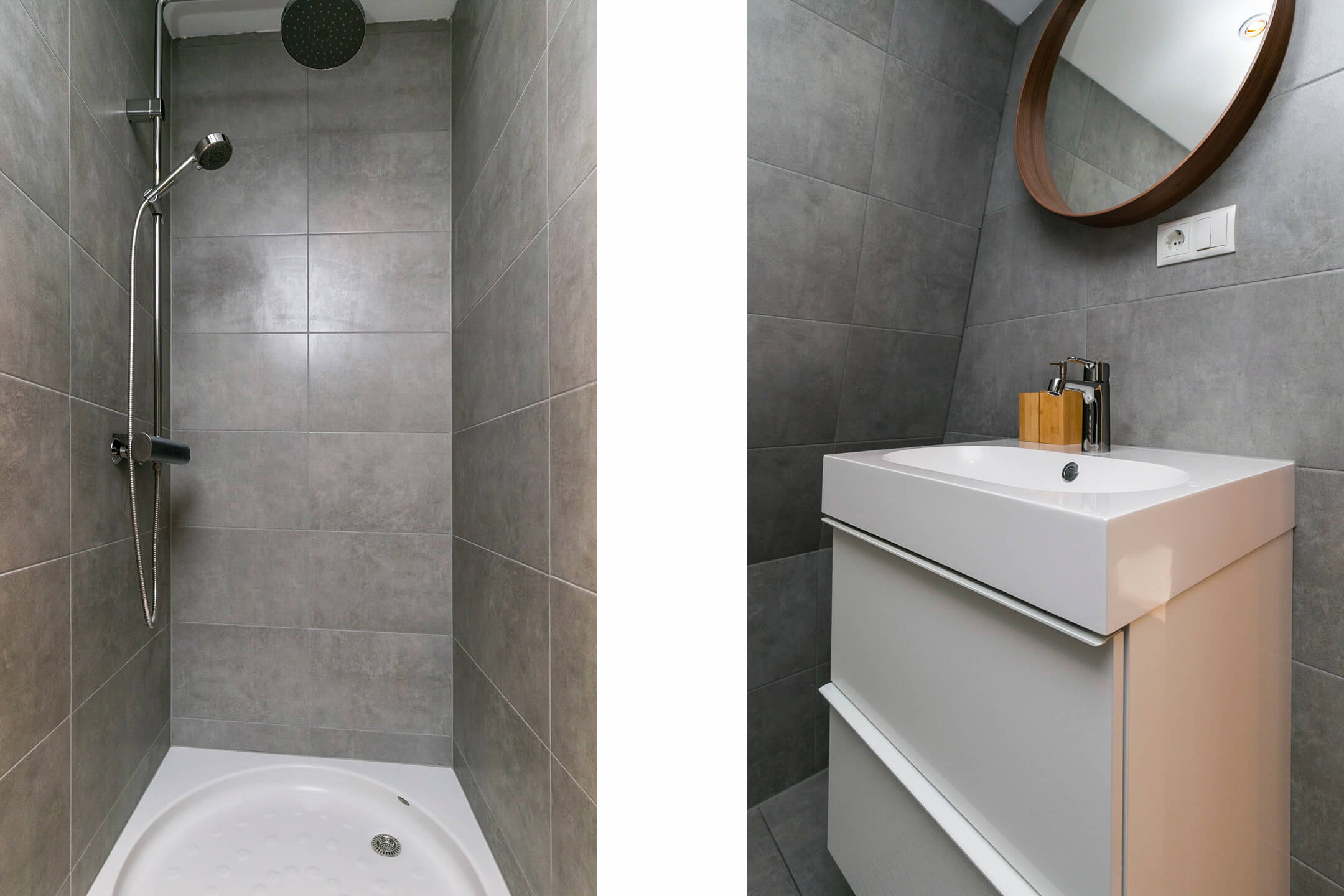 Deze etage beschikt over een grote ruimte die toegang biedt tot een ruim balkon (5M2) op het zuiden en de badkamer. De badkamer is volledig gerenoveerd en voorzien van een douche, toilet en wastafelmeubel. Er is nog een kleine ruimte die gebruikt zou kunnen worden als strijkkamer of kantoor.