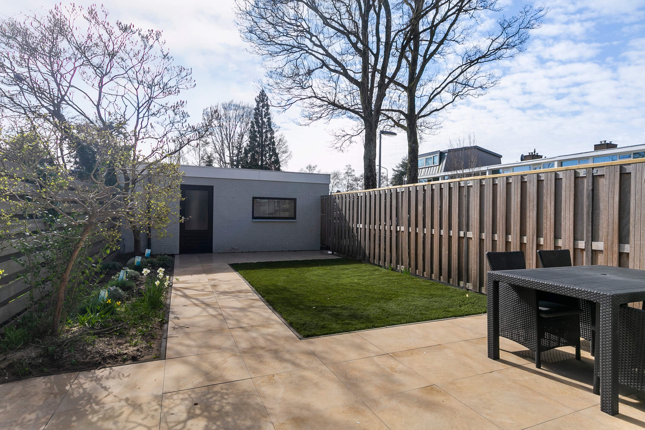 De royale tuin ligt op het zuiden waar u kunt de hele dag genieten van de zon. Op het terras staat een tuinset met 4 stoelen waar met zonnig weer aan gegeten en gewerkt kan worden. De tuin biedt toegang tot de garage van 35 M2 waar zich zowel elektra als een waterpunt bevindt.