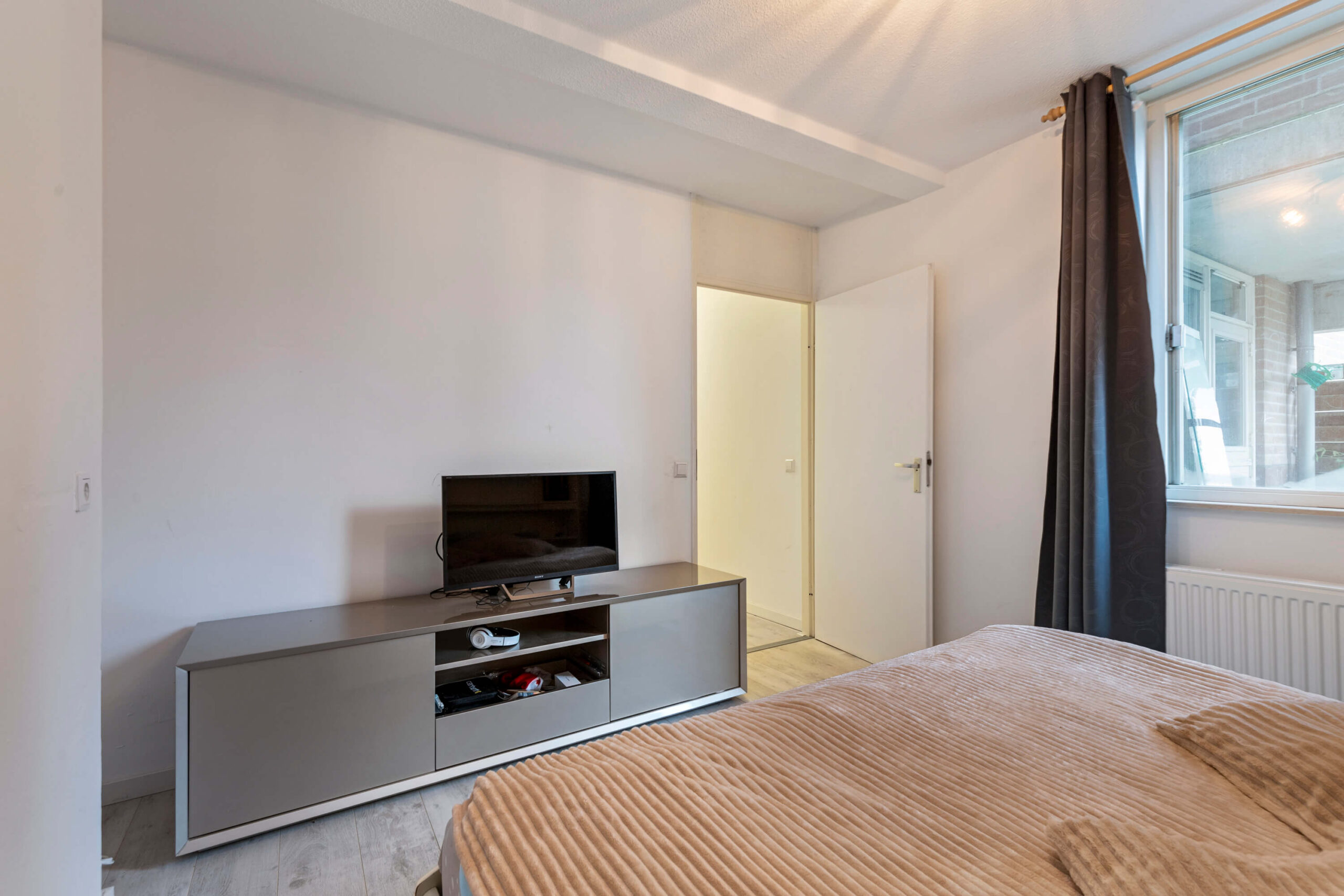 The spacious apartment complex has an intercom at the entrance. The apartment is located on the ground floor. Upon entering you arrive in the central hall that provides access to all rooms. The living room has a generous light fall that comes in through the large windows, which also provides access to the balcony at the front of the house. The living room has an open kitchen which is equipped with all modern appliances such as a dishwasher and microwave oven. A new dining area and sofa have been acquired for the living room.