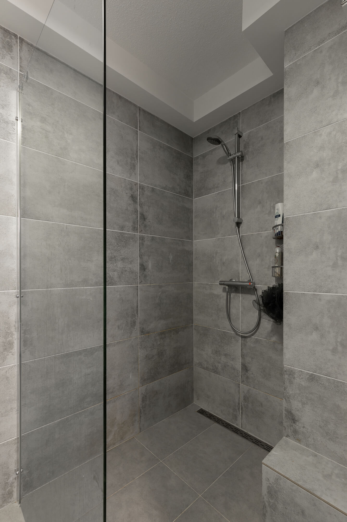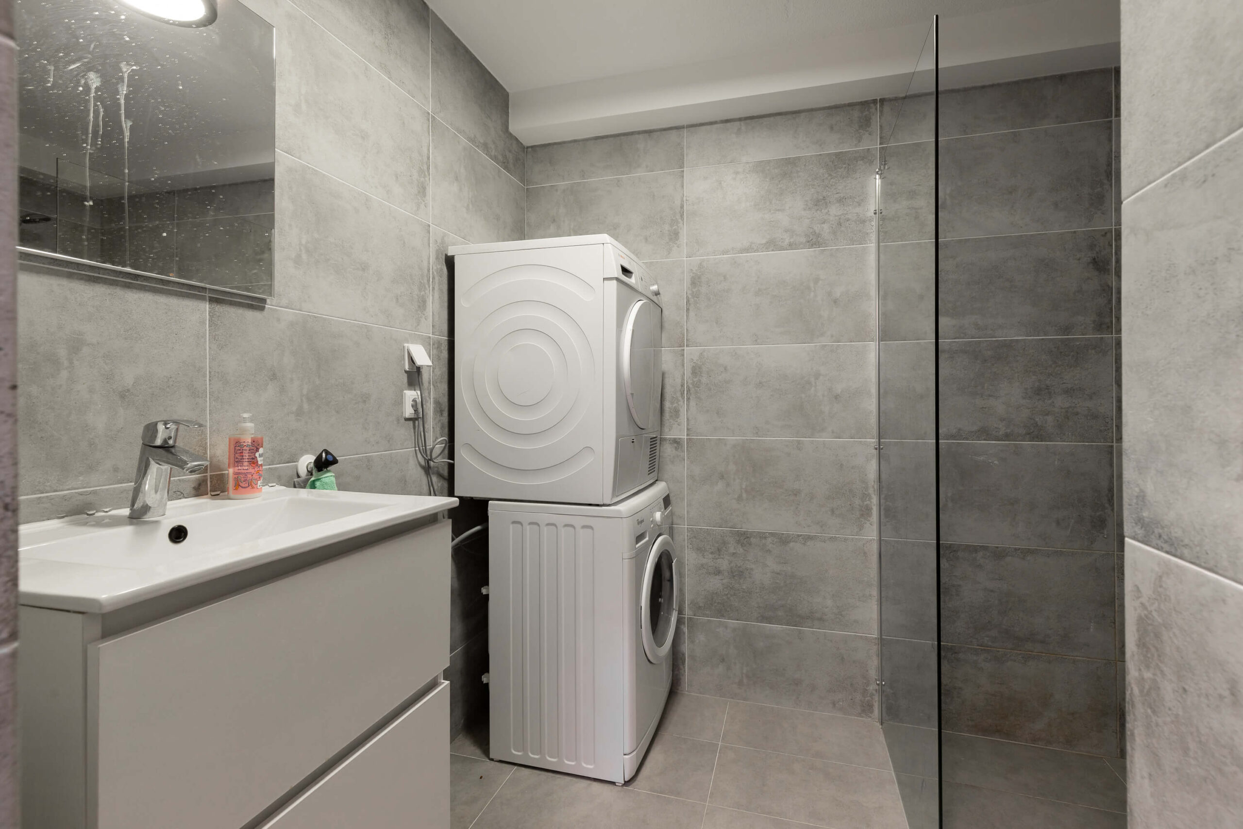 The bathroom is luxuriously tiled in a modern color scheme (anthracite-gray), equipped with a walk-in shower, washbasin and a separate washing machine and dryer. The hallway also provides access to the spacious separate toilet.