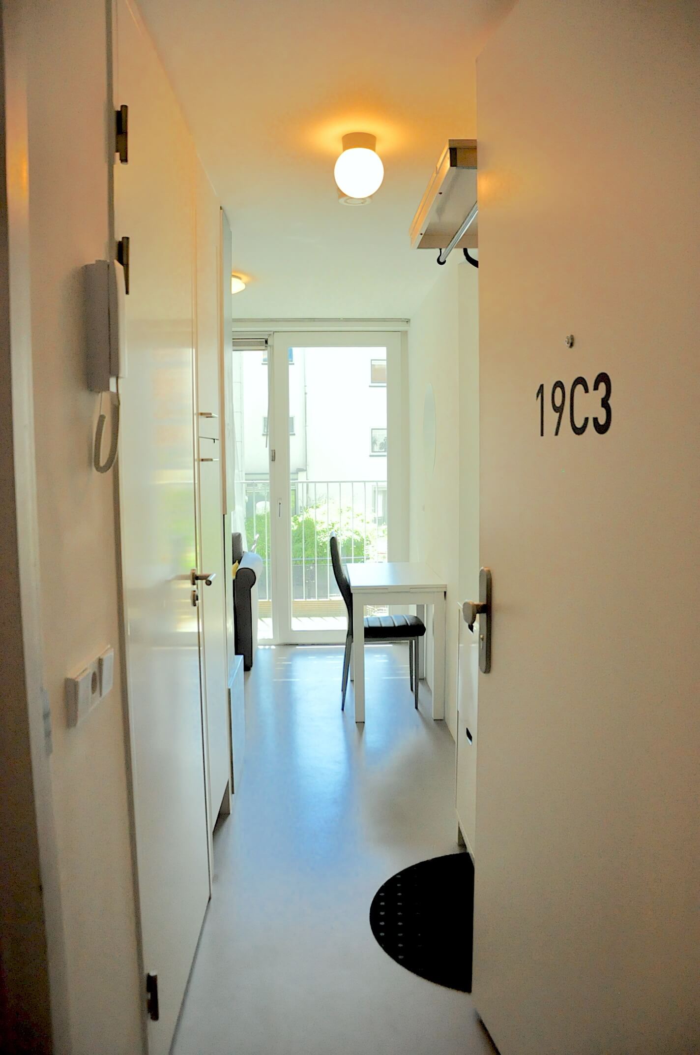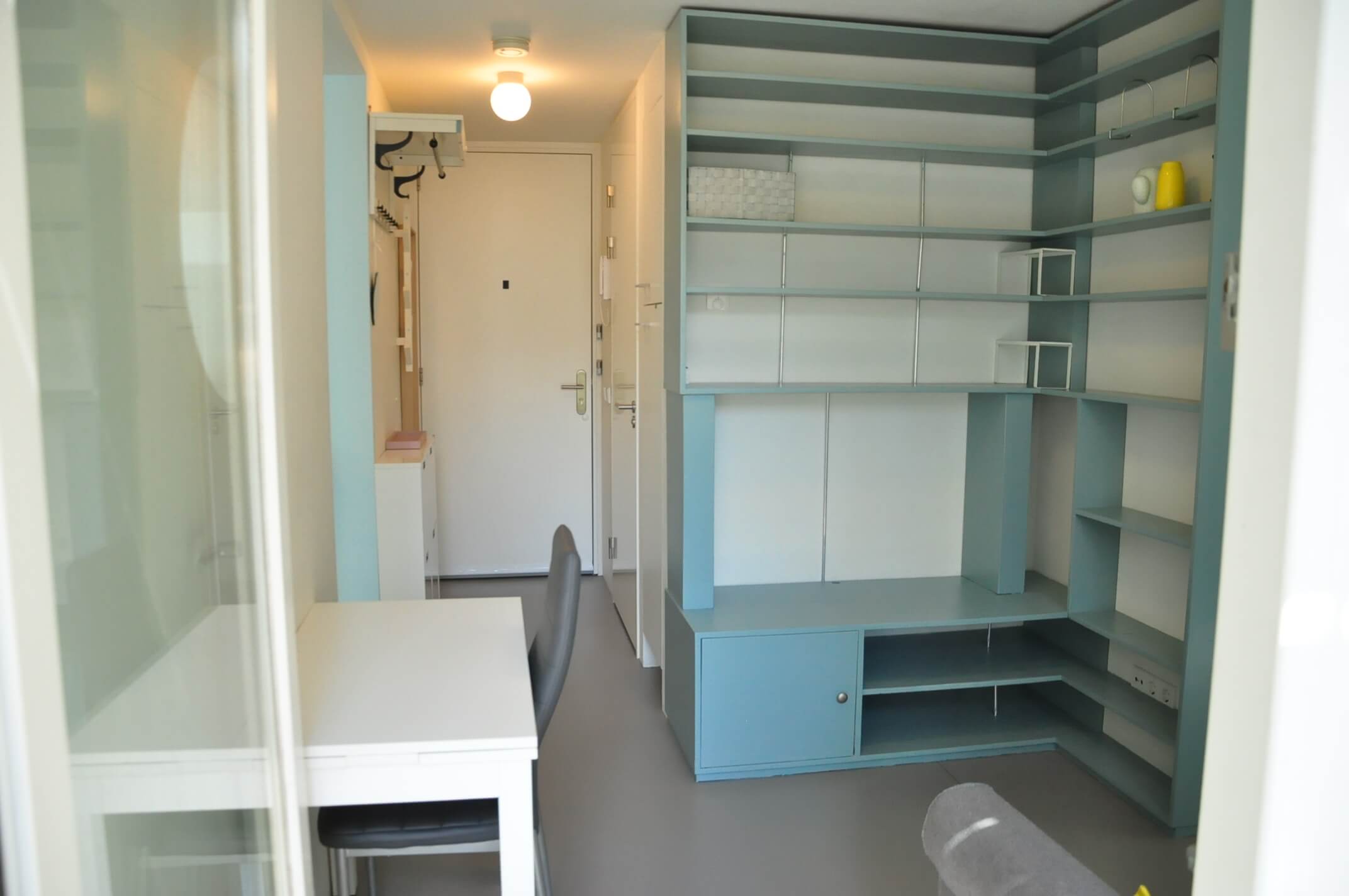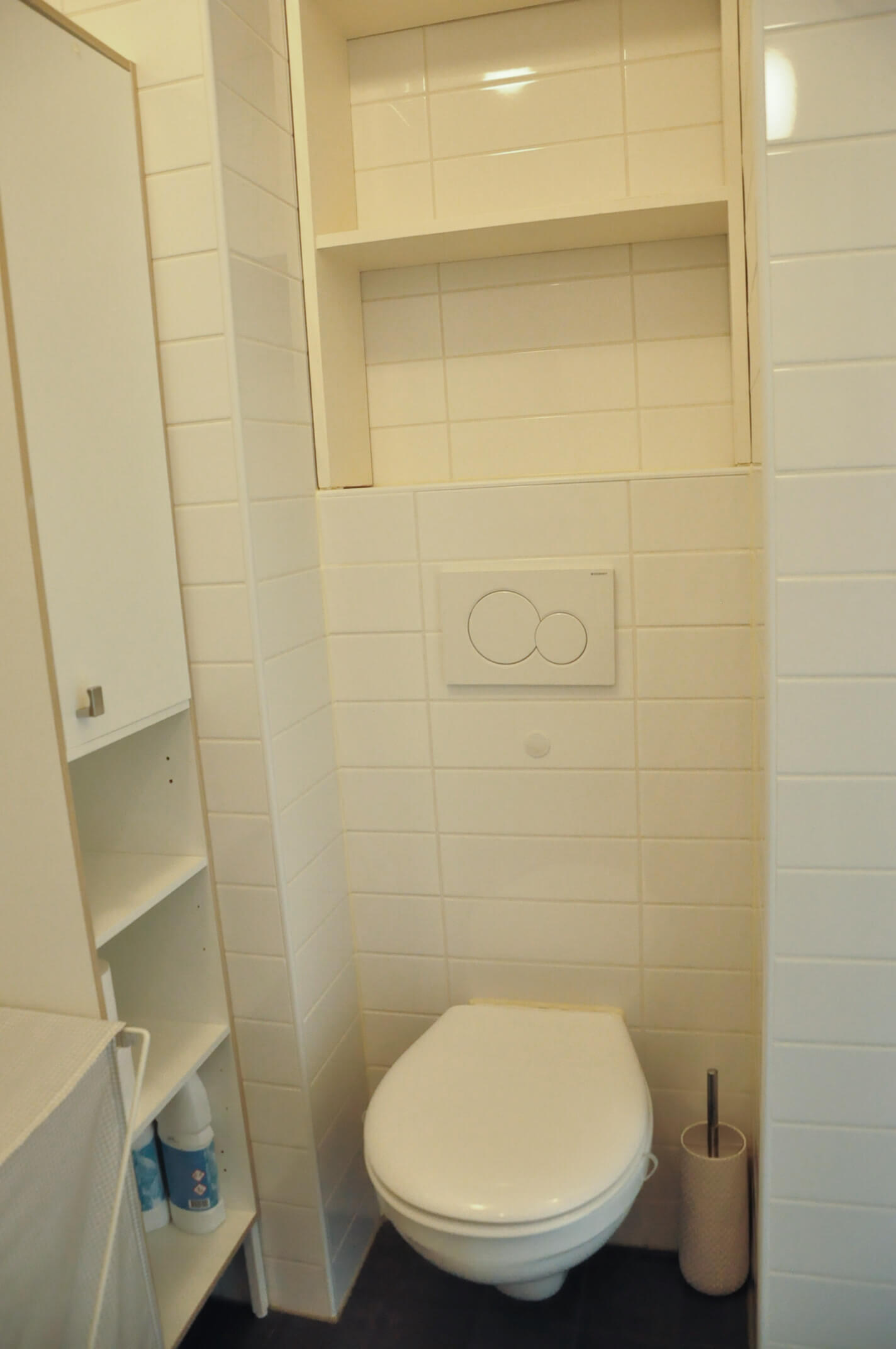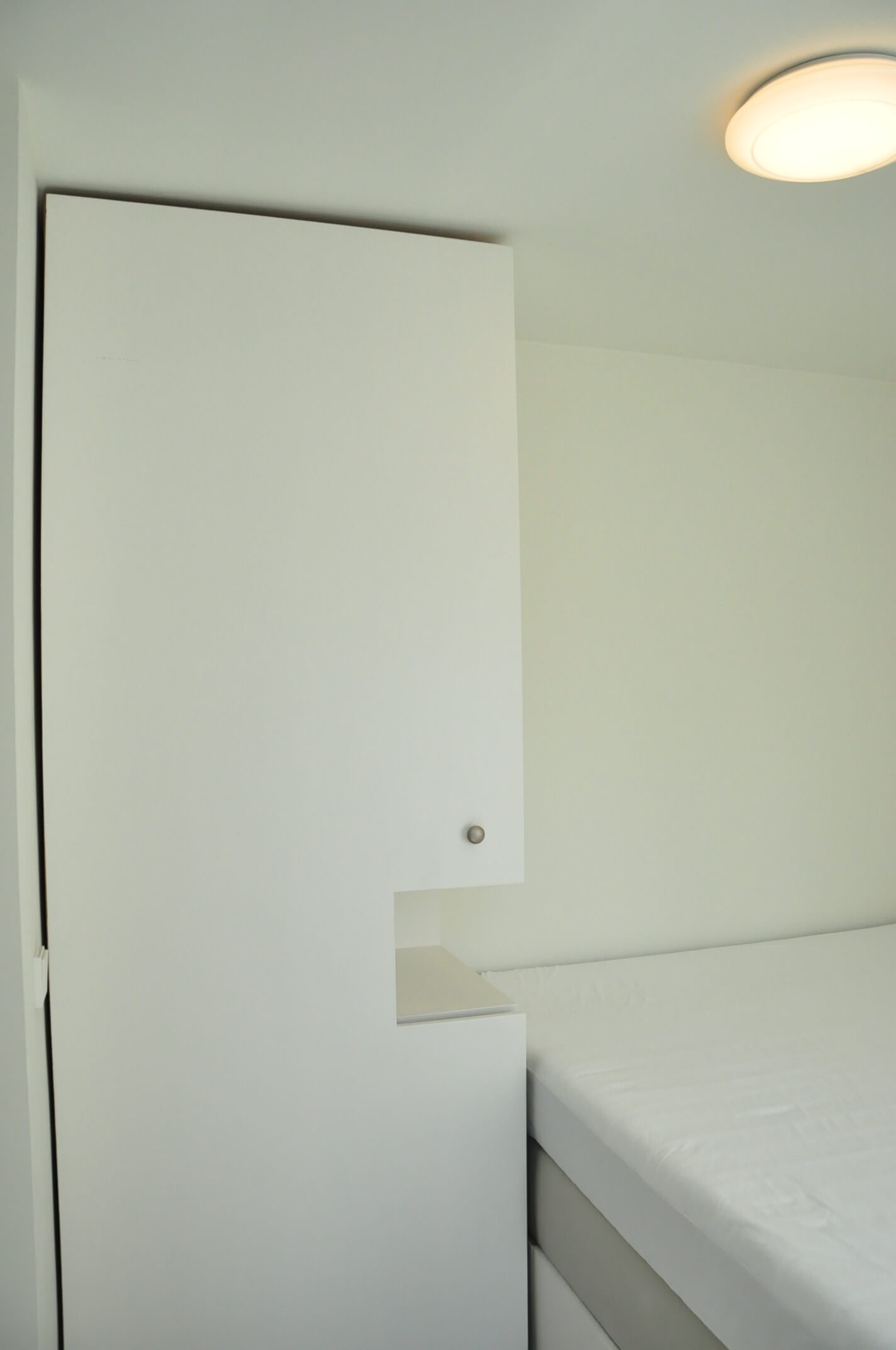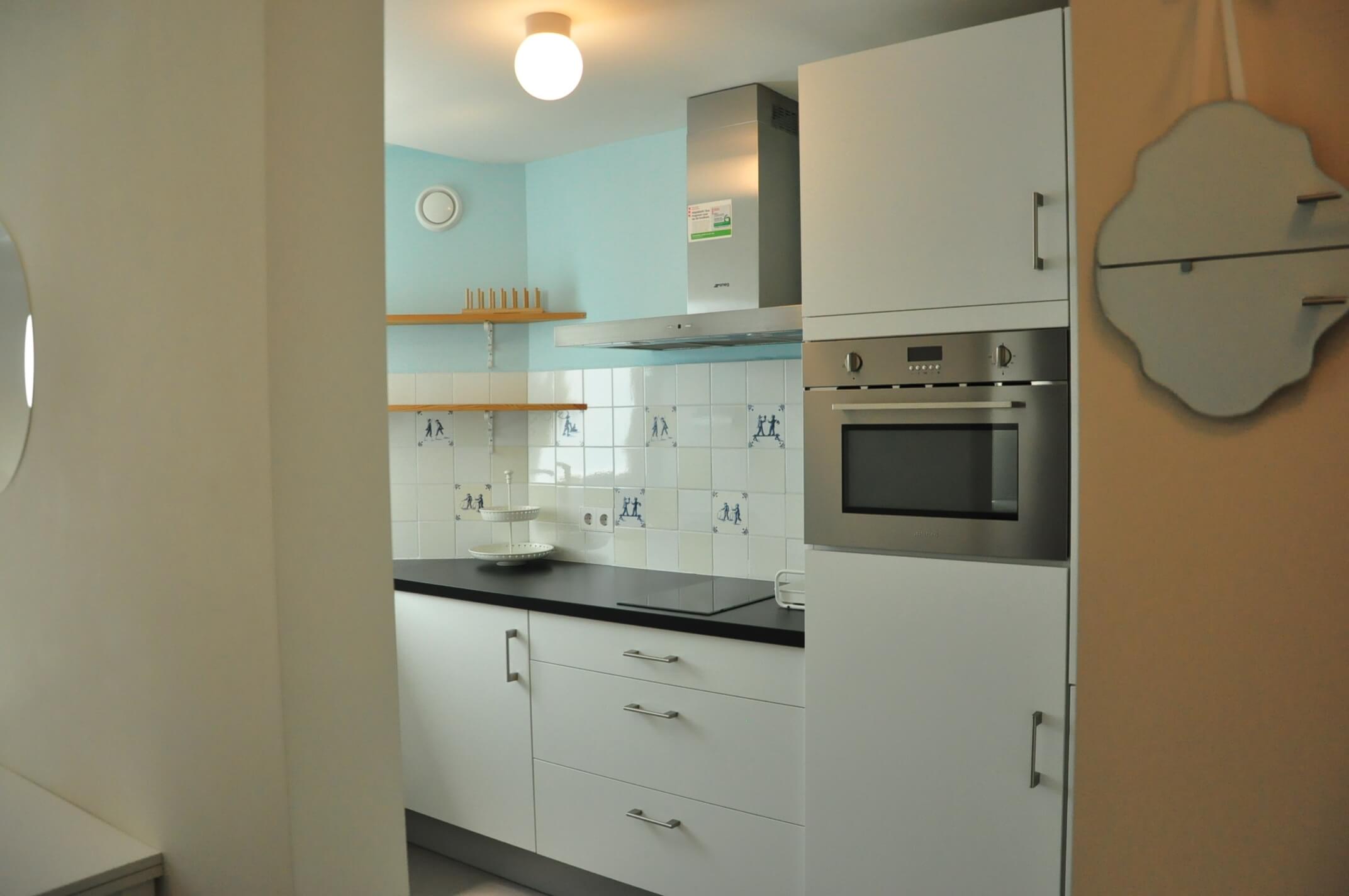 Entering the hall there is a built-in cupboard, shoe shelf and full-length mirror. From the hall you step into the living room with a fitted TV / bookshelf. On the left side of the living room there is a semi-open kitchen.