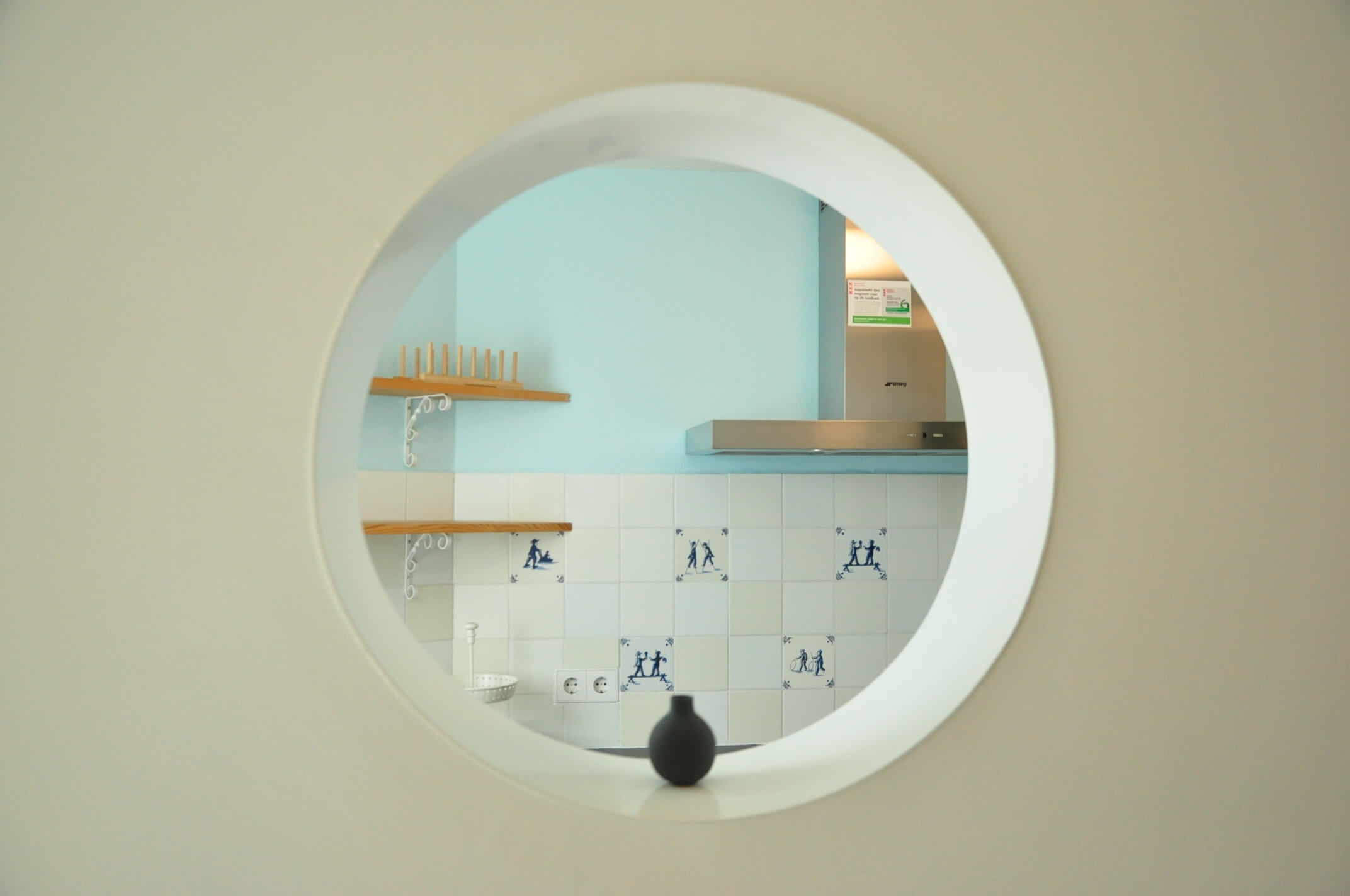 The luxury kitchen is finished with Delft blue tiles. It is completed with built-in appliances: a Quooker (instant boiling water), oven & microwave combination, washer & dryer combination, fridge & freezer, dishwasher, induction cooking plate and an extractor hood. All kitchen appliances are from the brand SMEG.