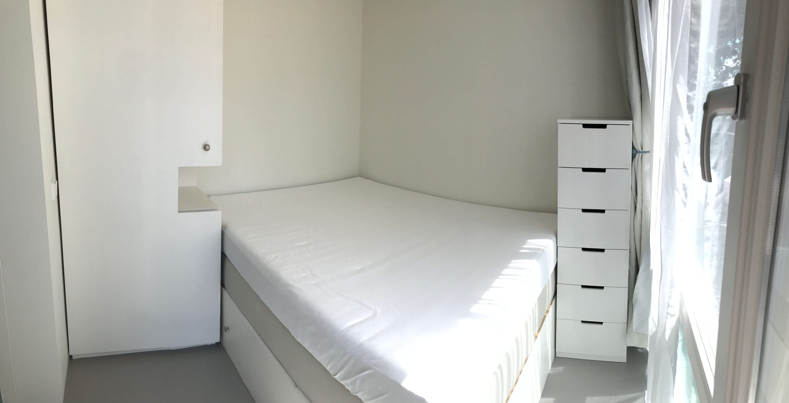 The Bedroom is equipped with a queen size bed, a closet and a drawer. There is extra storage space designed under the box spring bed.