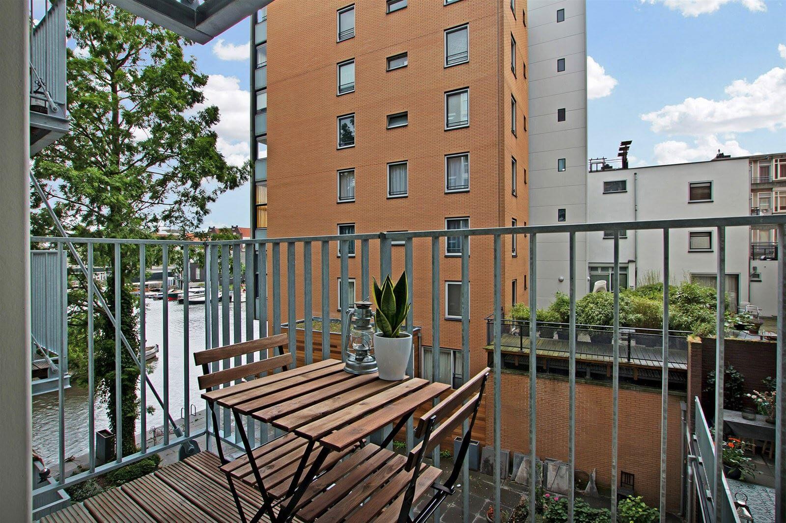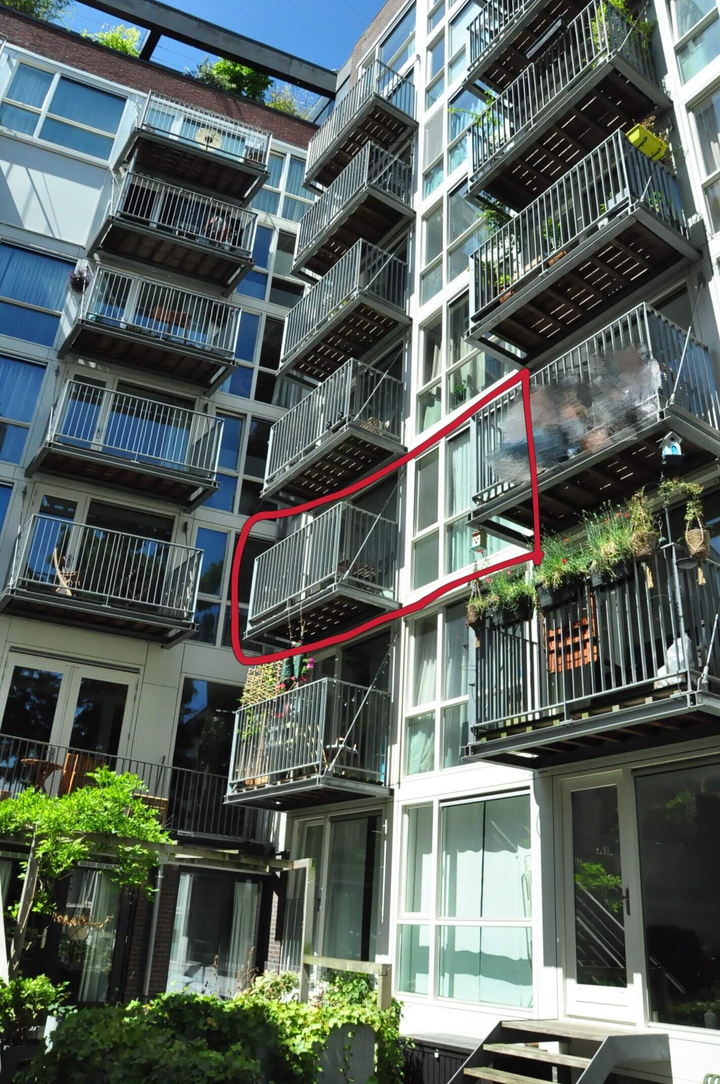 The sunny balcony is accessible from the living room, with a good view over the common garden and canal.
