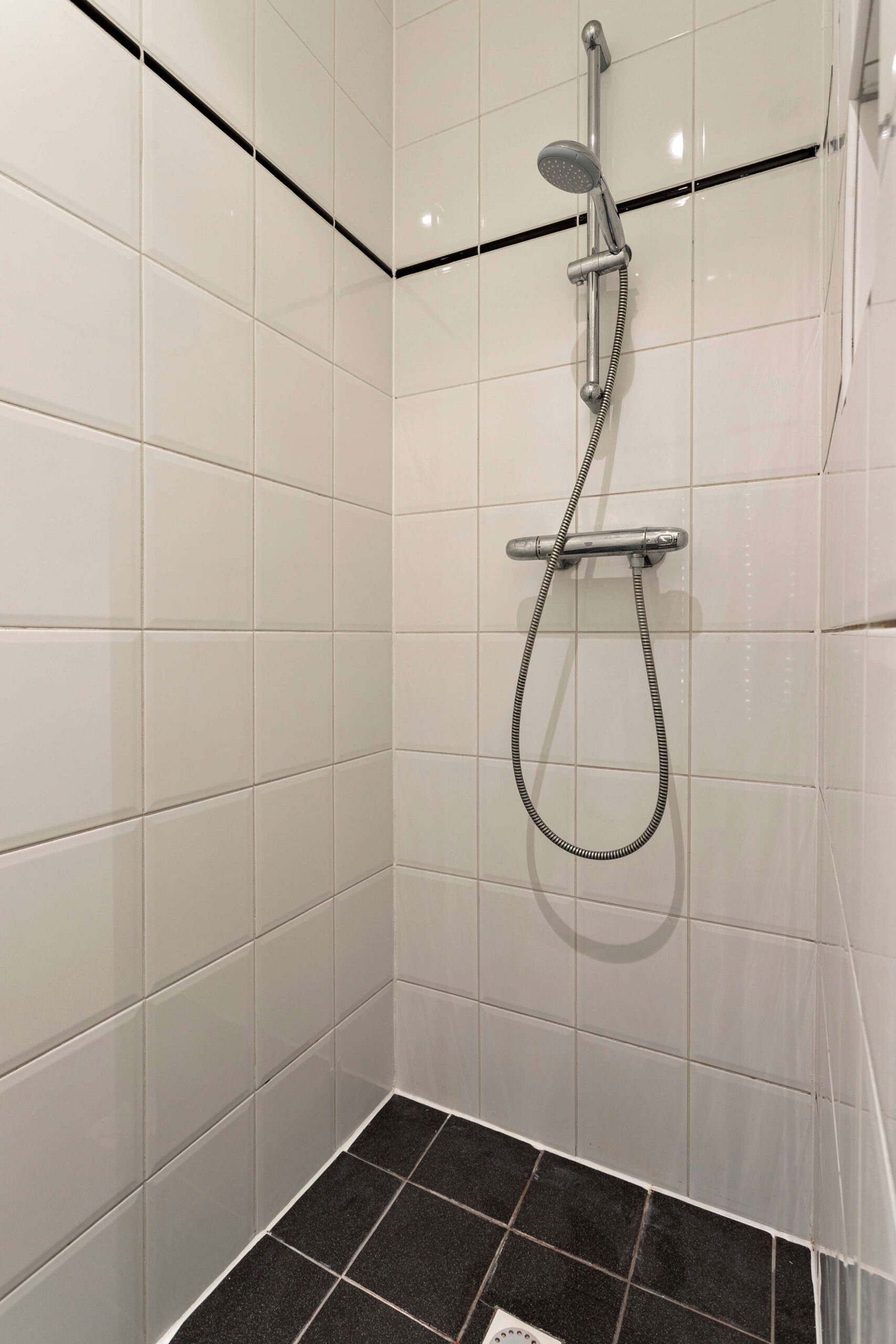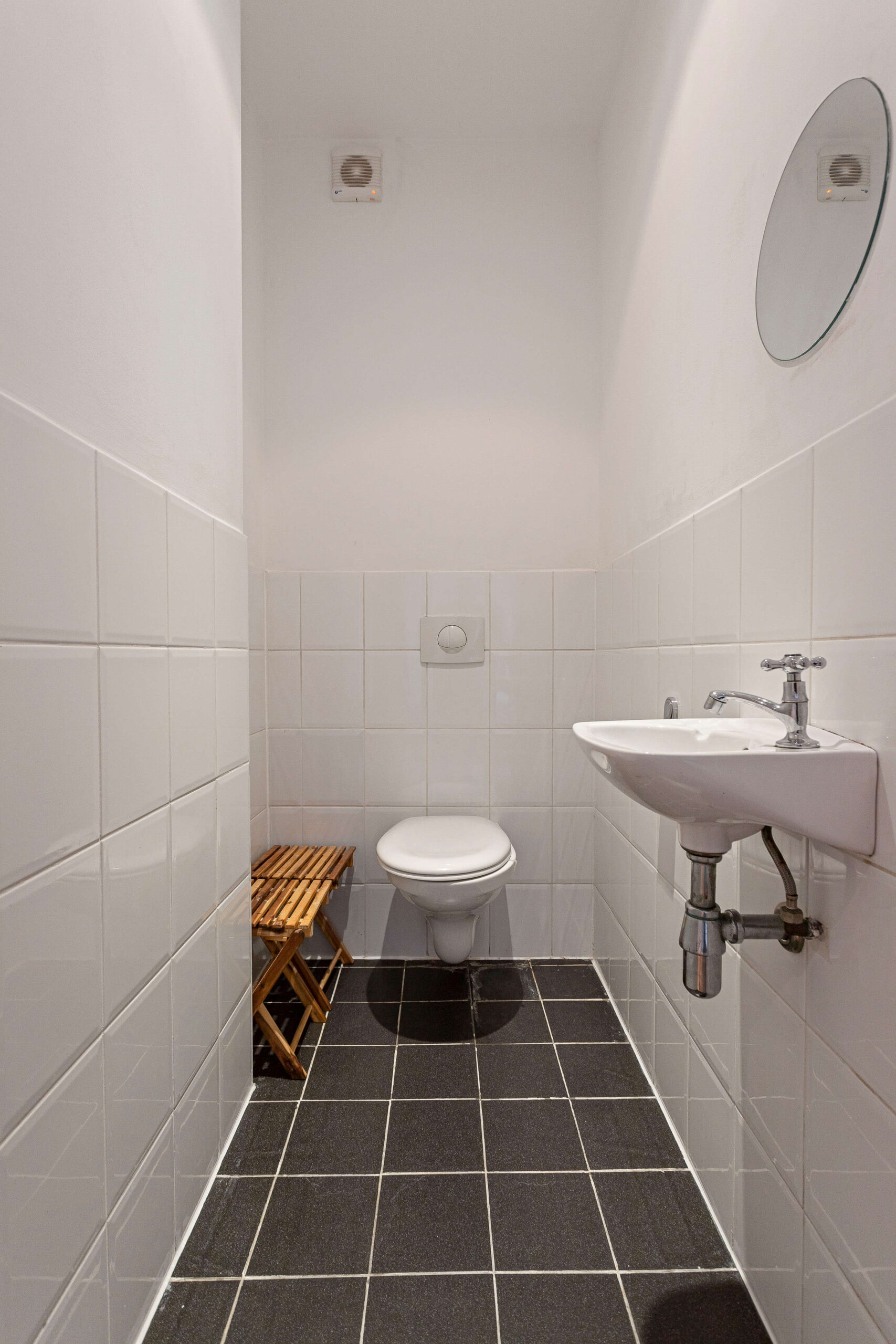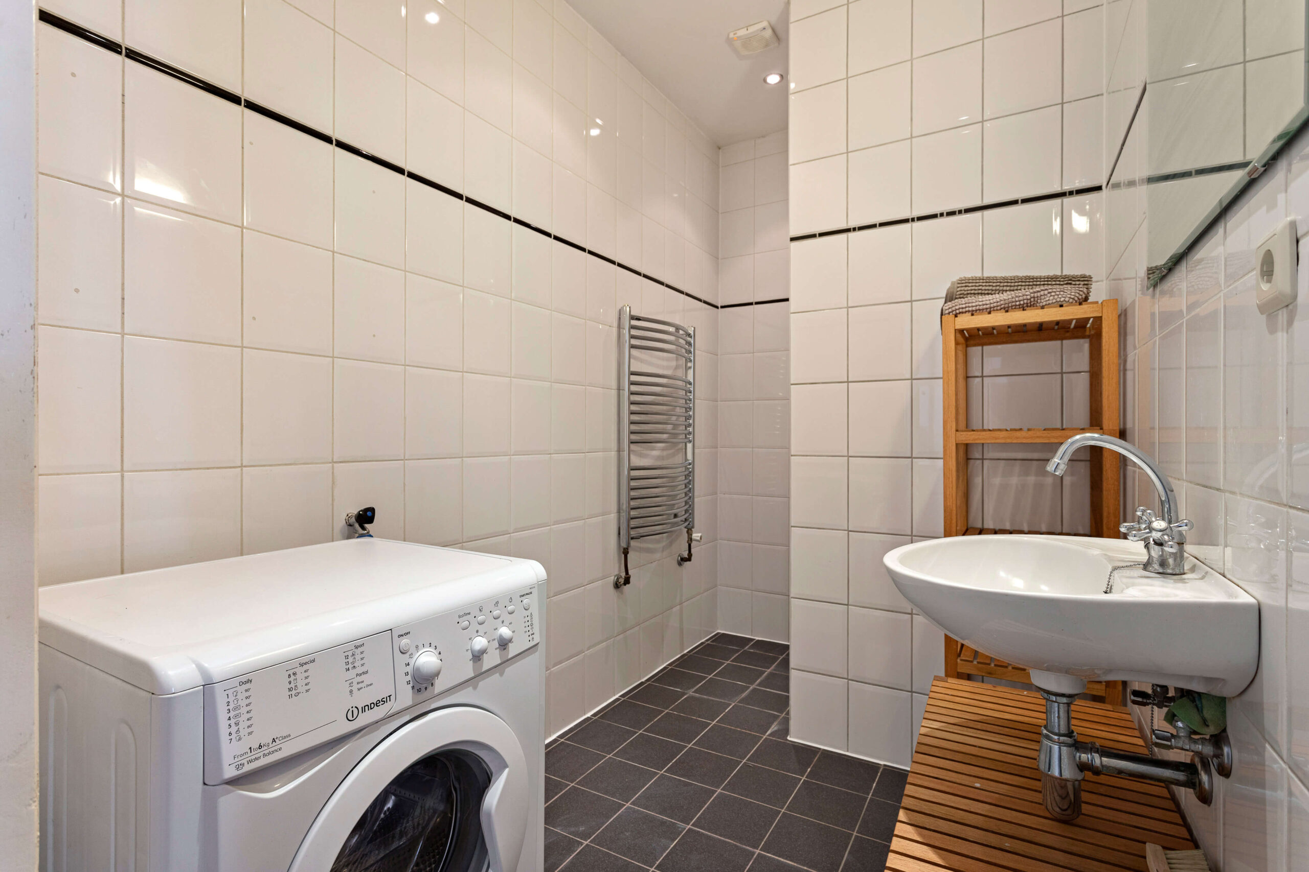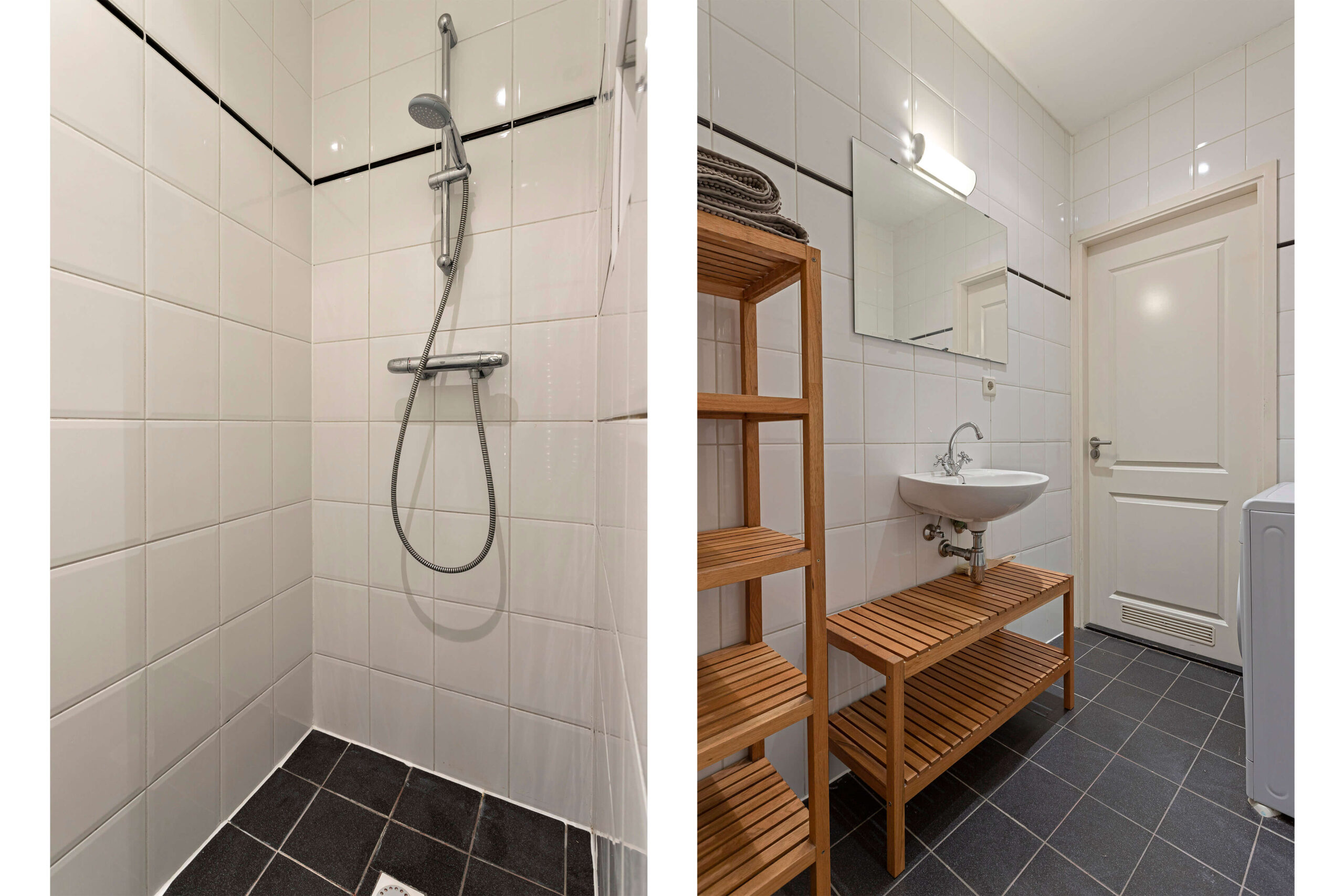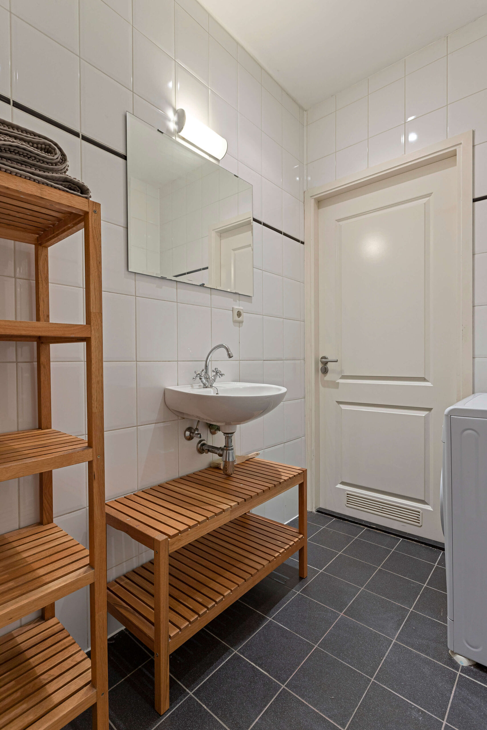 De badkamer is voorzien van een inloopdouche, een wasmachine en een wasbak. Er is een apart toilet, bereikbaar via de centrale hal. Zowel de badkamer als het toilet zijn voorzien van mechanische ventilatie.