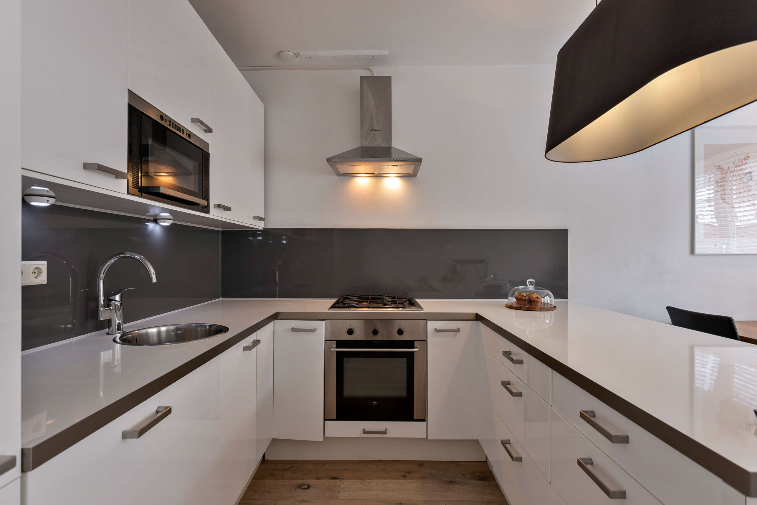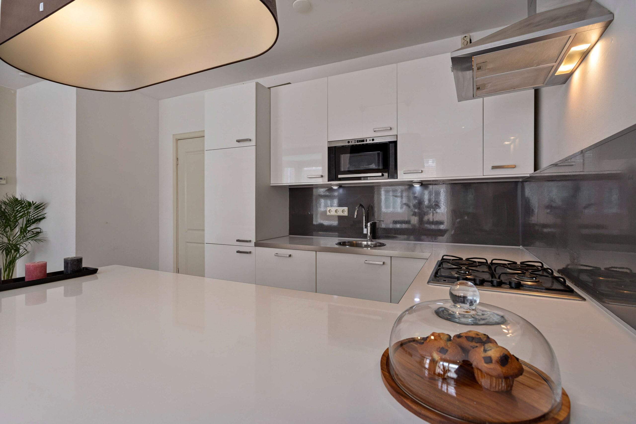 Het appartement is gelegen op de 2e verdieping van een karakteristiek pand. Het appartement is bereikbaar door een gedeeld trappenhuis. Bij binnenkomst staat u in de centrale gang die toegang biedt tot alle ruimtes. De woonkamer is heel licht en heeft een grote raampartij. Een van de ramen heeft een erker waar een gezellig plekje is gemaakt om te zitten. De kamer is uitgerust met een grote, zes persoons eettafel, comfortabele bank en een flatscreen televisie. In de woonkamer is een grote open keuken met moderne apparatuur en een bar. Aan de bar staan 2 barstoelen om aan te ontbijten, de dag door te nemen tijdens het koken of te entertainen tijdens etentjes.