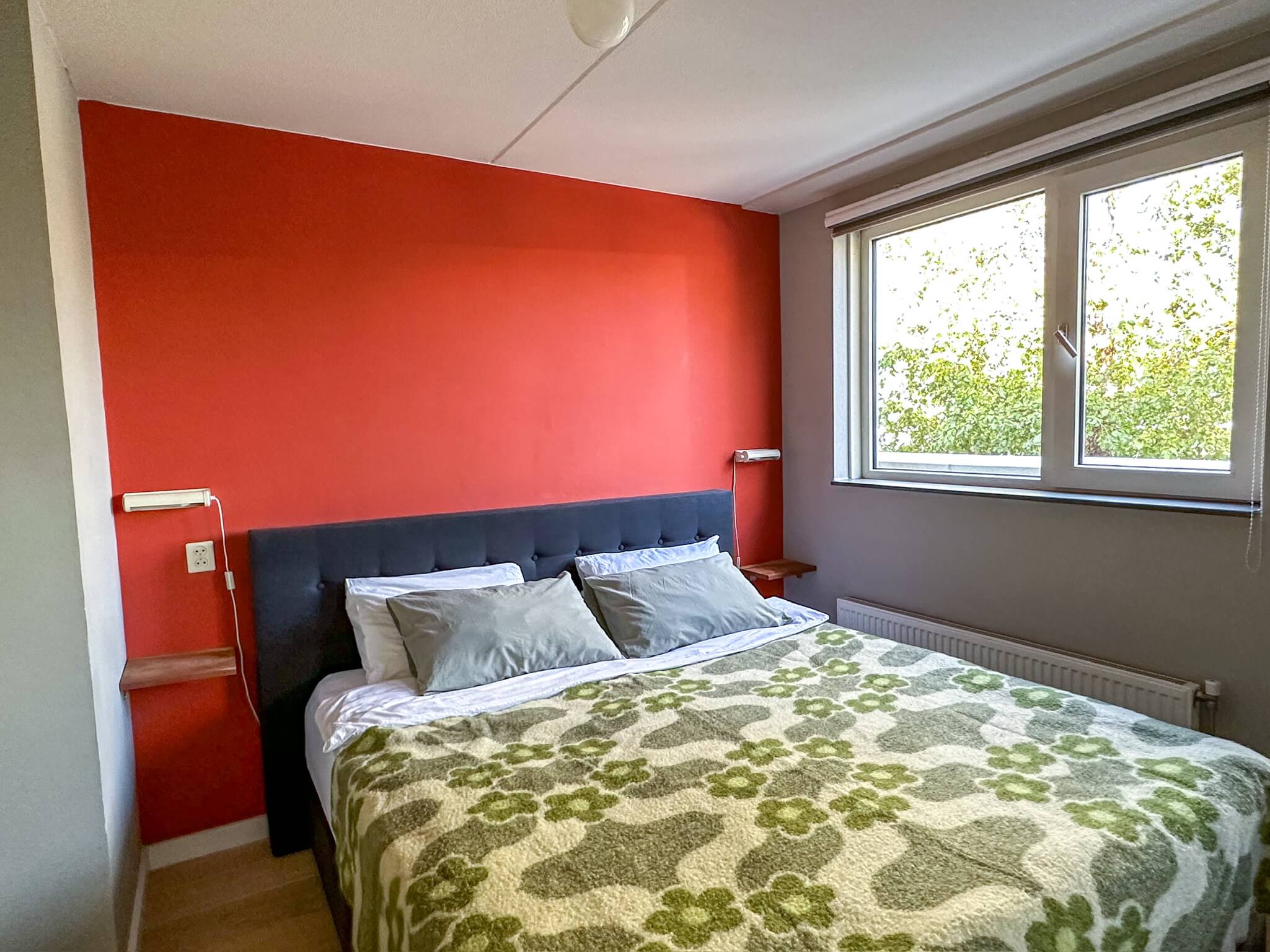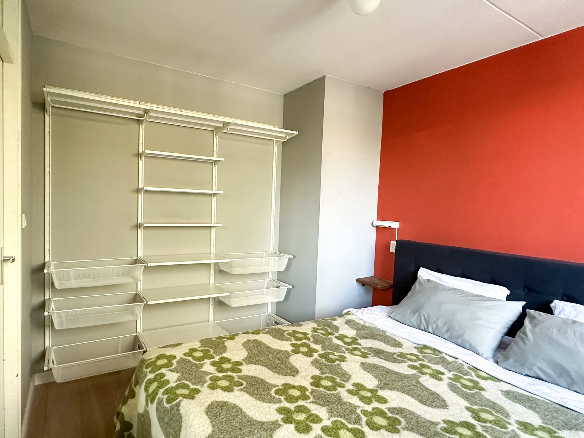 Rechts bevindt zich de slaapkamer, waar een ruim 2 persoons bed kan staan. De rekken en planken om kleding op te bergen zullen in het appartement blijven.
