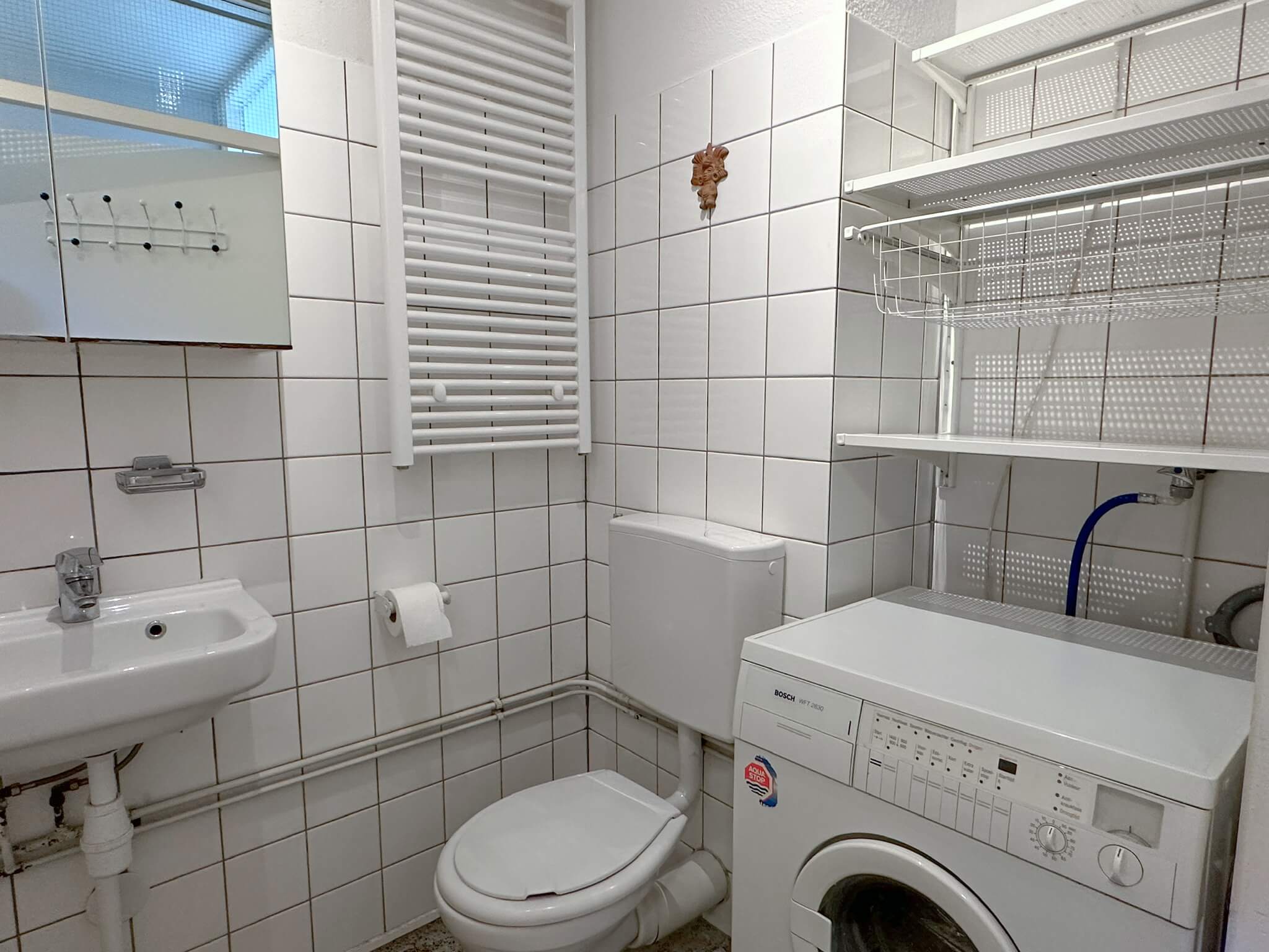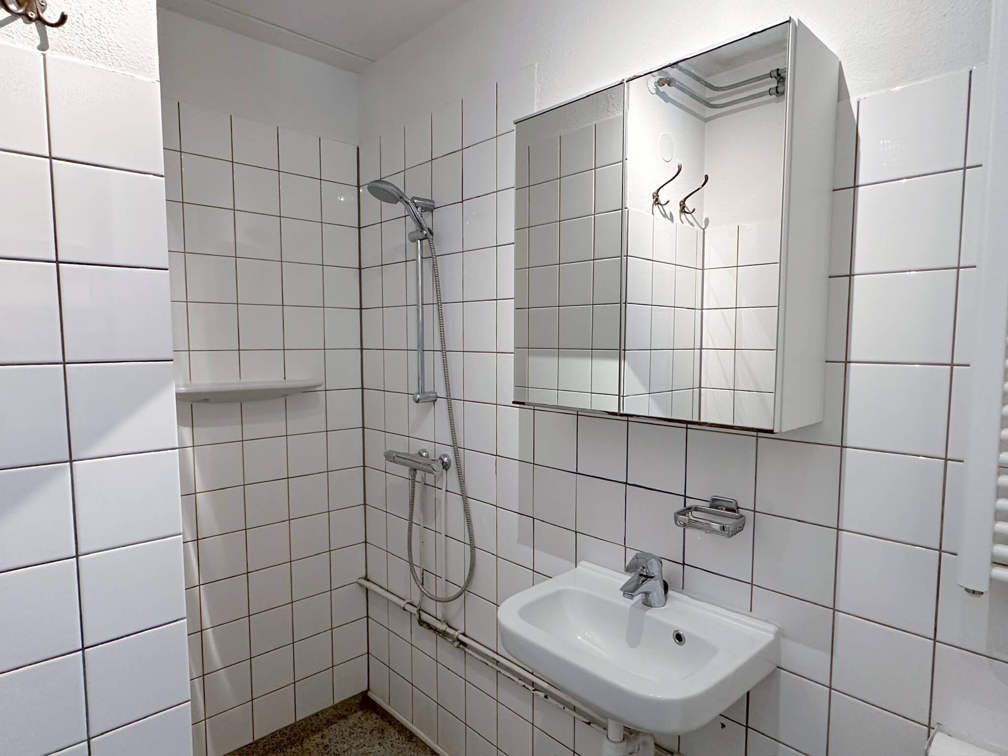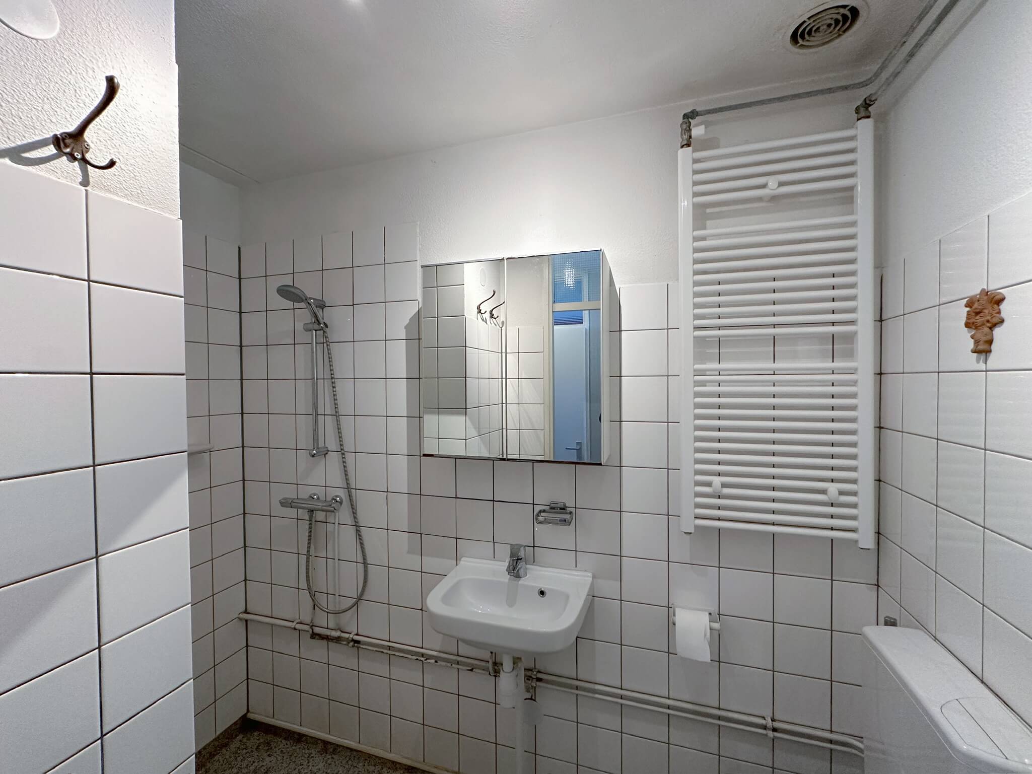 De badkamer is voorzien van een inloopdouche, toilet en wastafel.