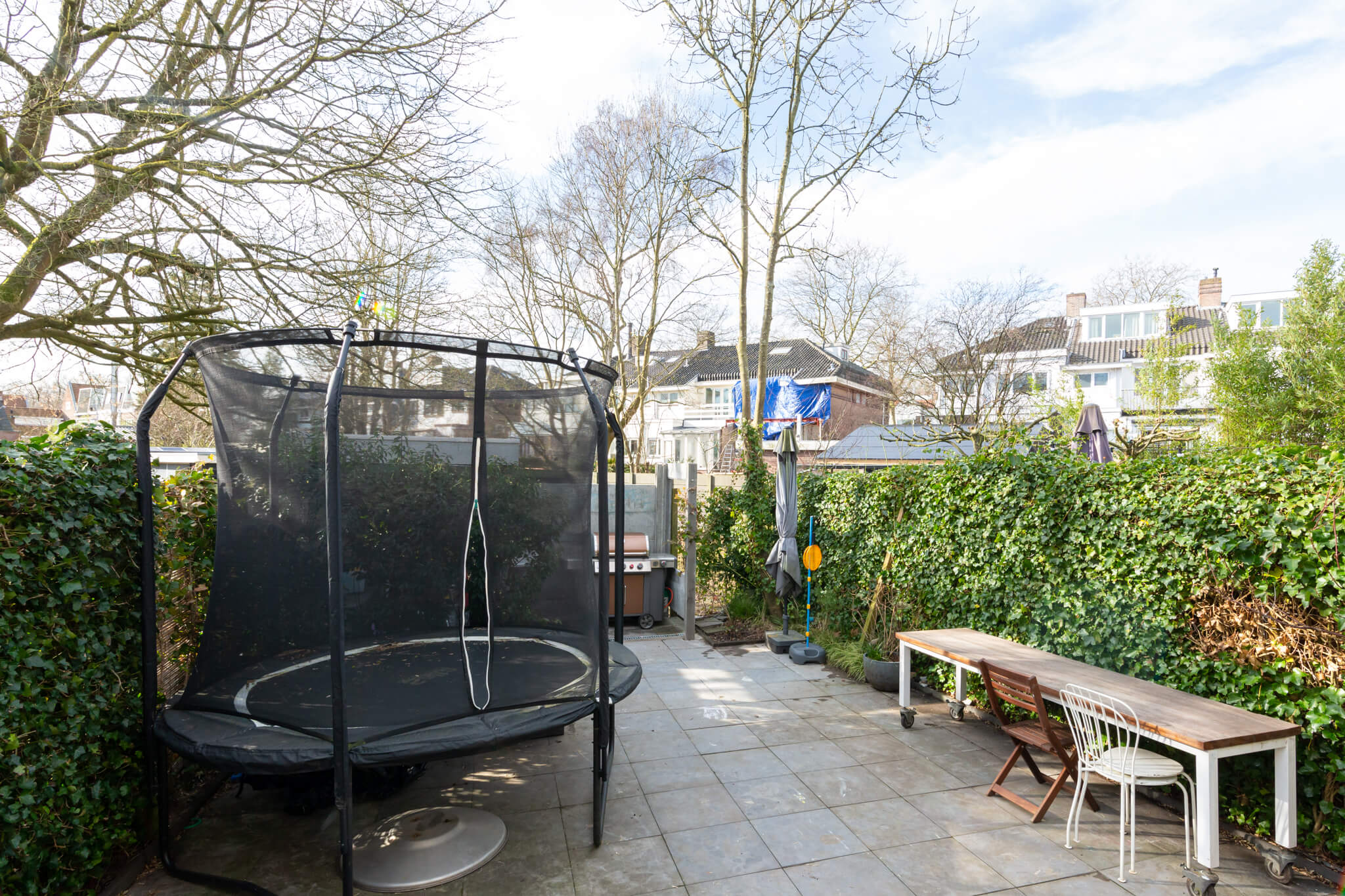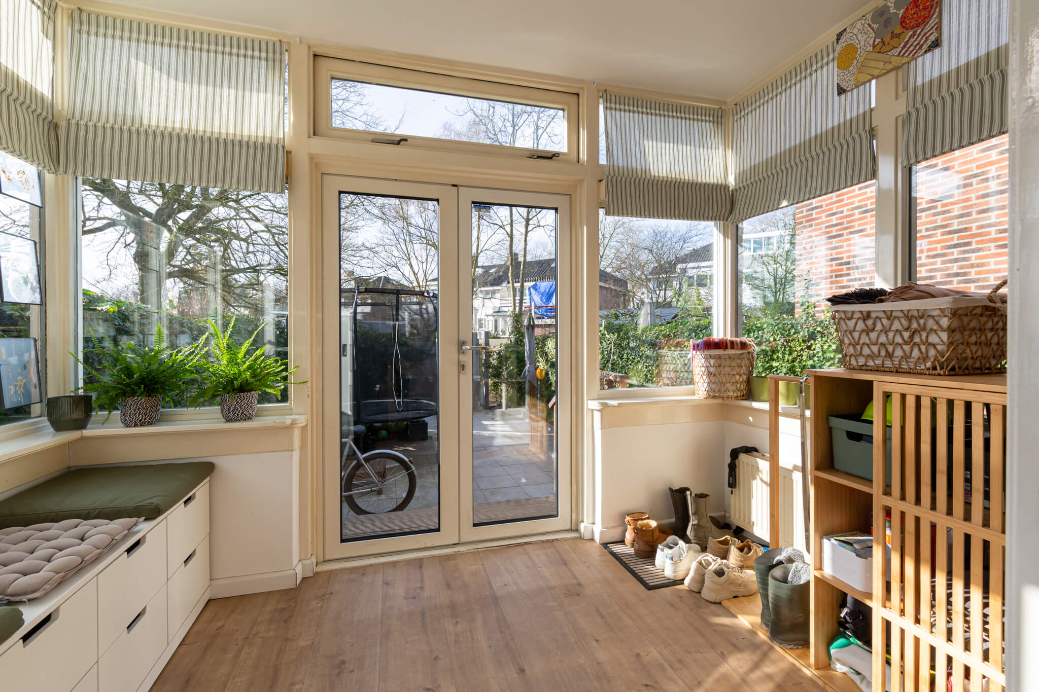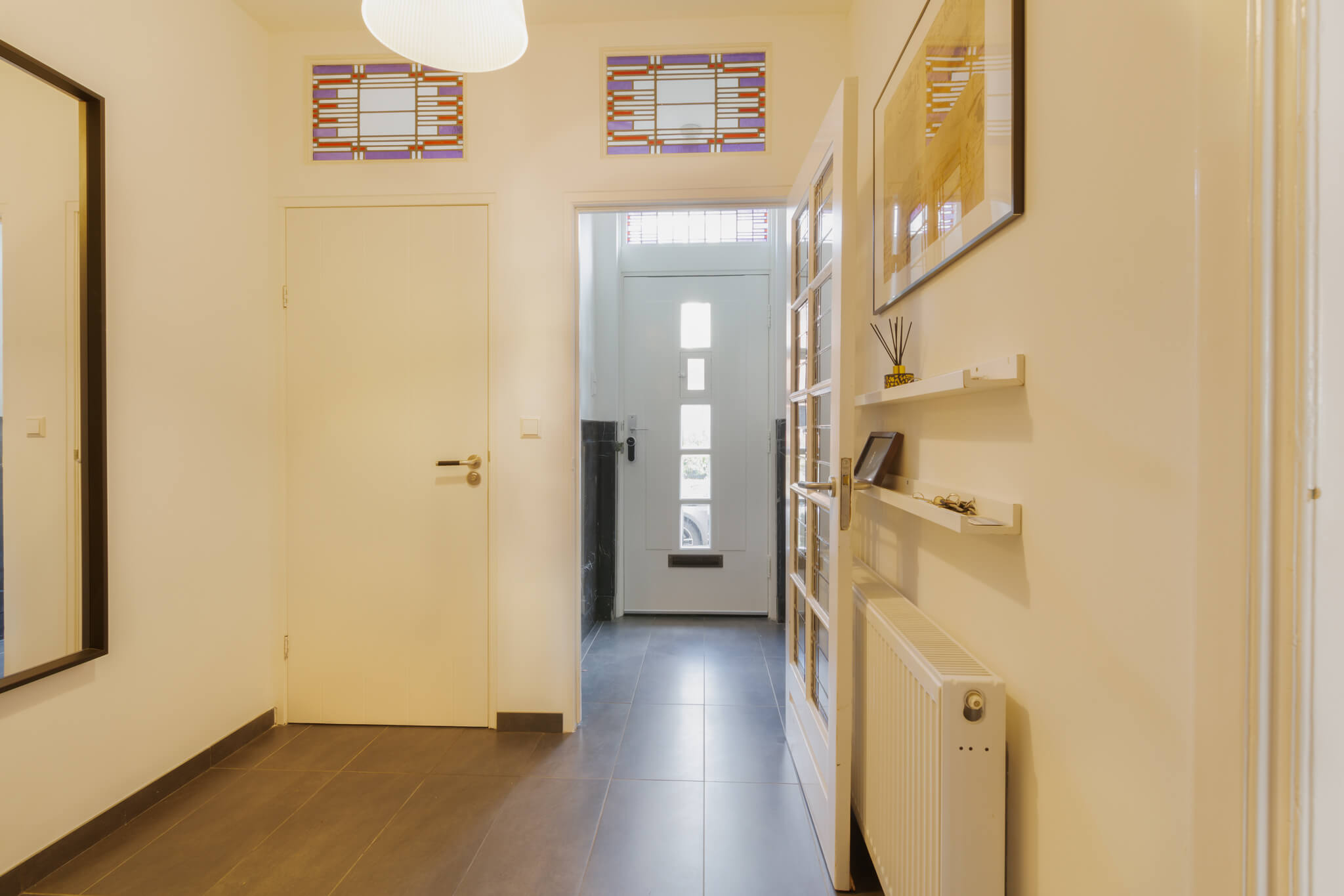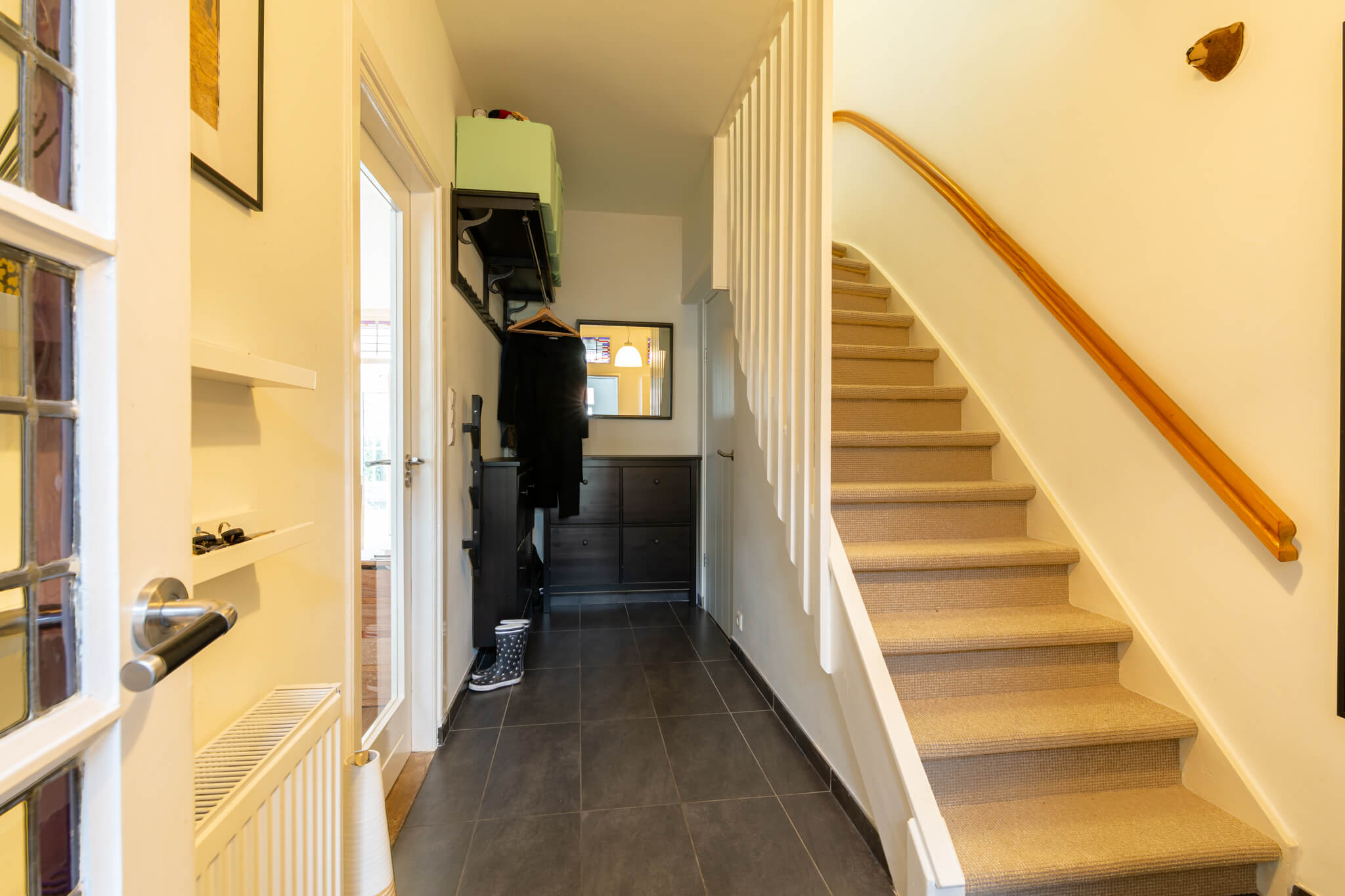 Voor het huis is een kleine binnentuin, waar plek is om bv. fietsen te plaatsen of een bankje neer te zetten. Bij binnenkomst staat u in de hal die ruimte biedt om jassen en schoenen op te bergen en toegang geeft tot het gastentoilet en de kelder. In de hal zijn de karakteristiek glas-in-lood ramen bewaard gebleven. Op de begaande grond is een lichte doorzonwoonkamer met open keuken en de originele serre uit de jaren dertig. De woonkamer is voorzien van airconditioning.