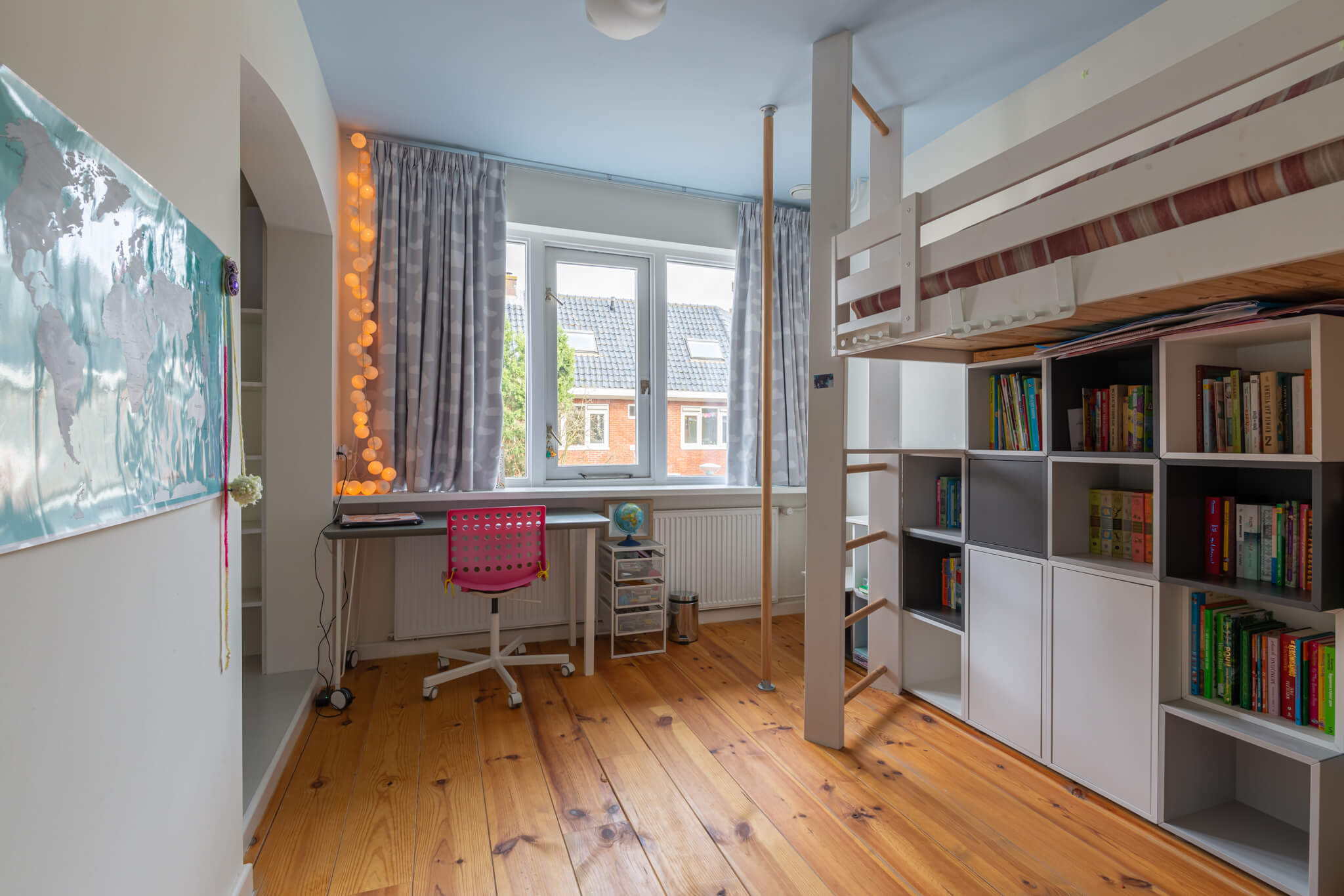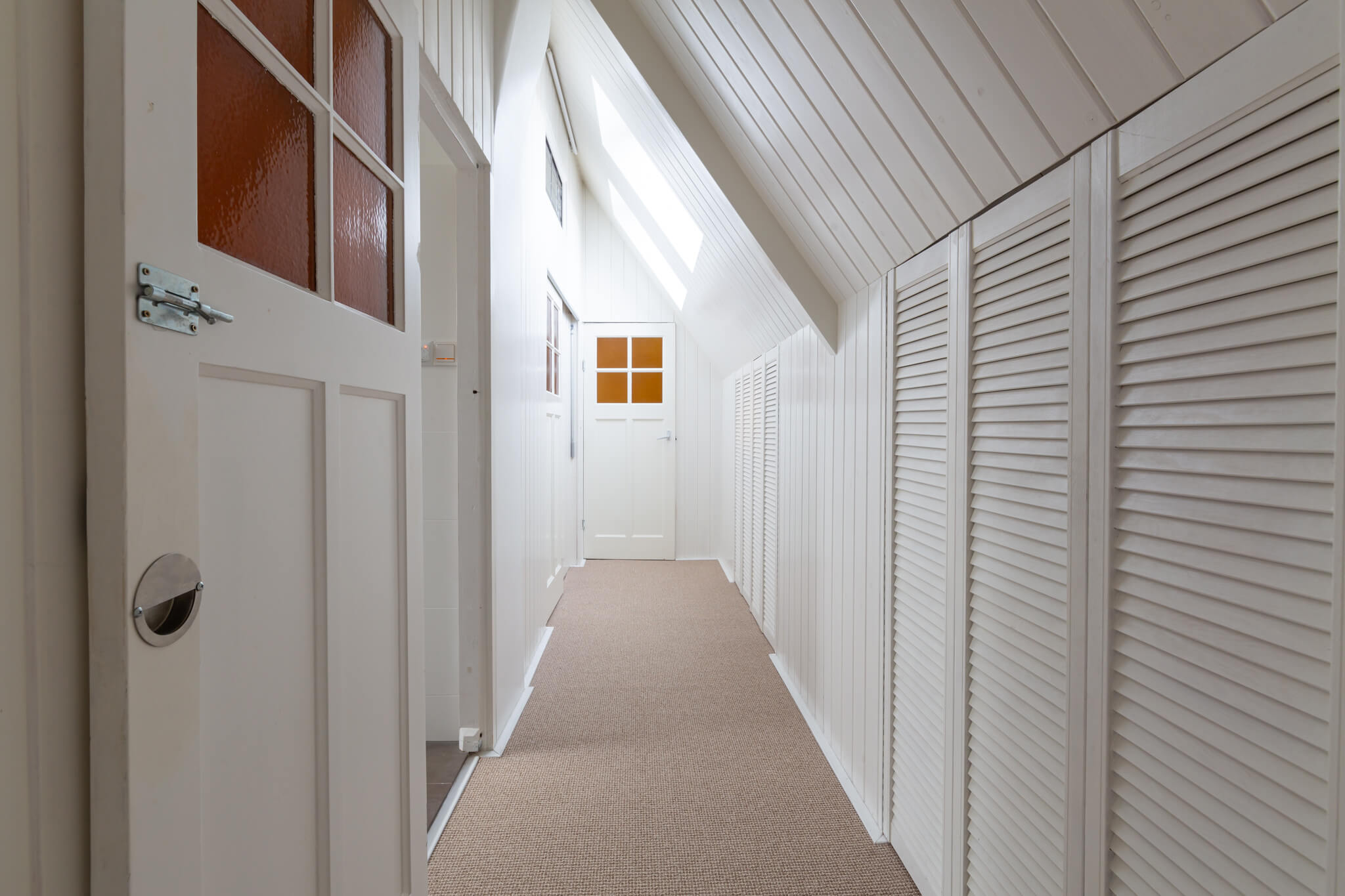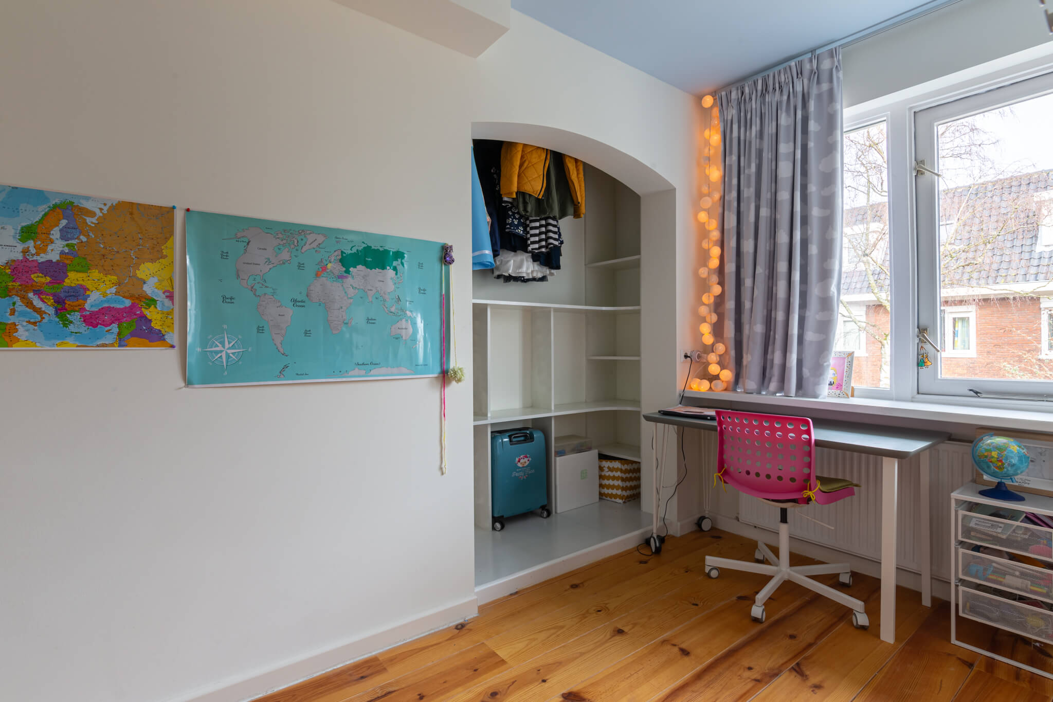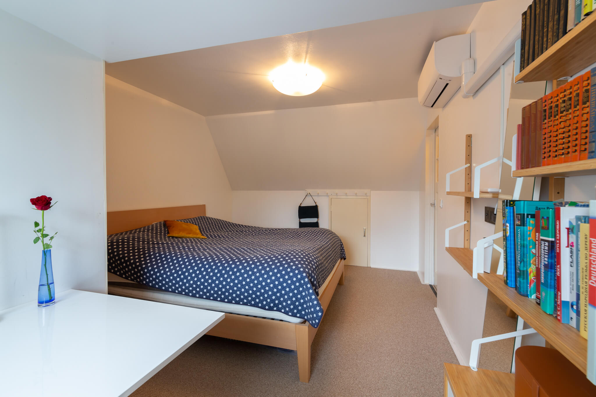 De 2e etage biedt veel privacy, ideaal voor een au pair of logees. Deze verdieping heeft 2 slaapkamers. Een van de slaapkamers is uitgerust met airconditioning. De badkamer is voorzien van een inloopdouche, toilet en wastafel. Op de zolderverdieping is veel inpandige bergruimte gerealiseerd door middel van inbouwkasten.