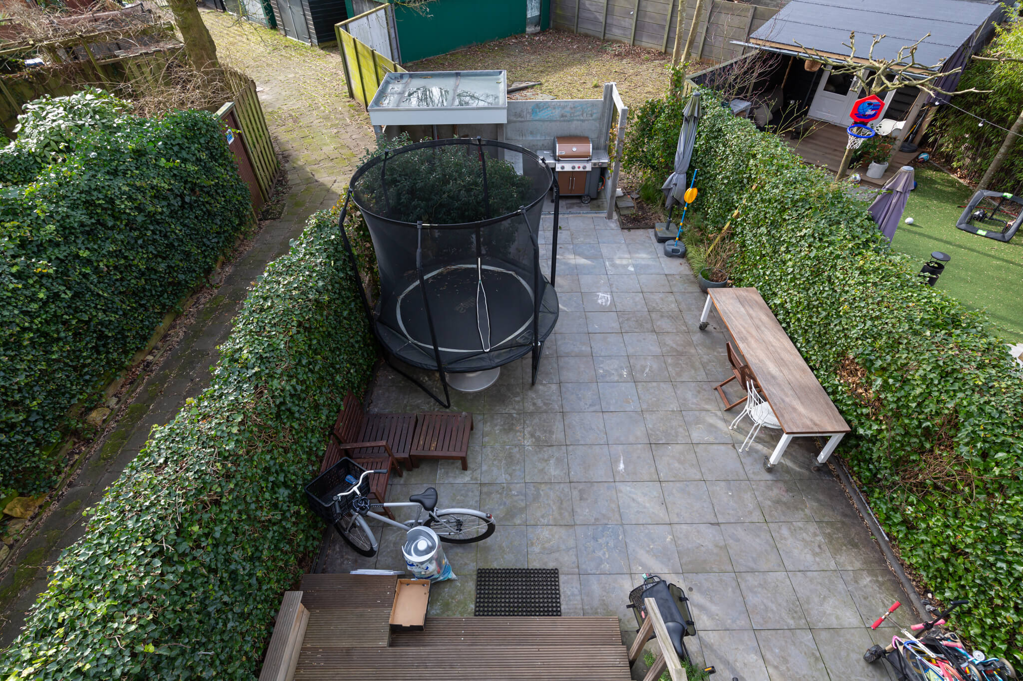 De serre geeft toegang tot een ruime tuin van ca. 70 m2 op het zuidwesten. De tuin is grotendeels betegeld. Via de passage die bij het huis hoort kan de tuin ook via een achterom bereikt worden. In de tuin staat een overdekte fietsenberging om rijwielen droog te stallen.