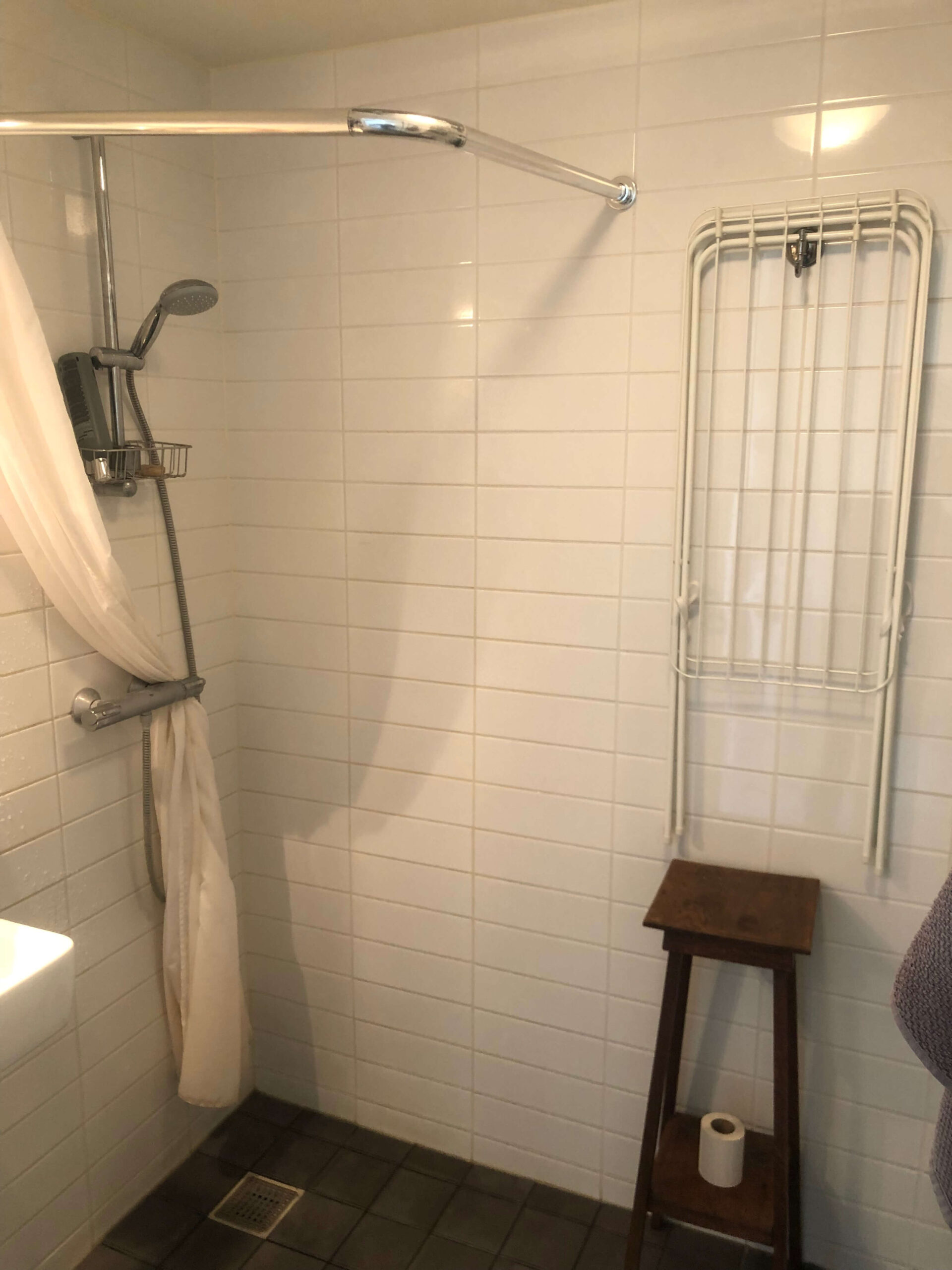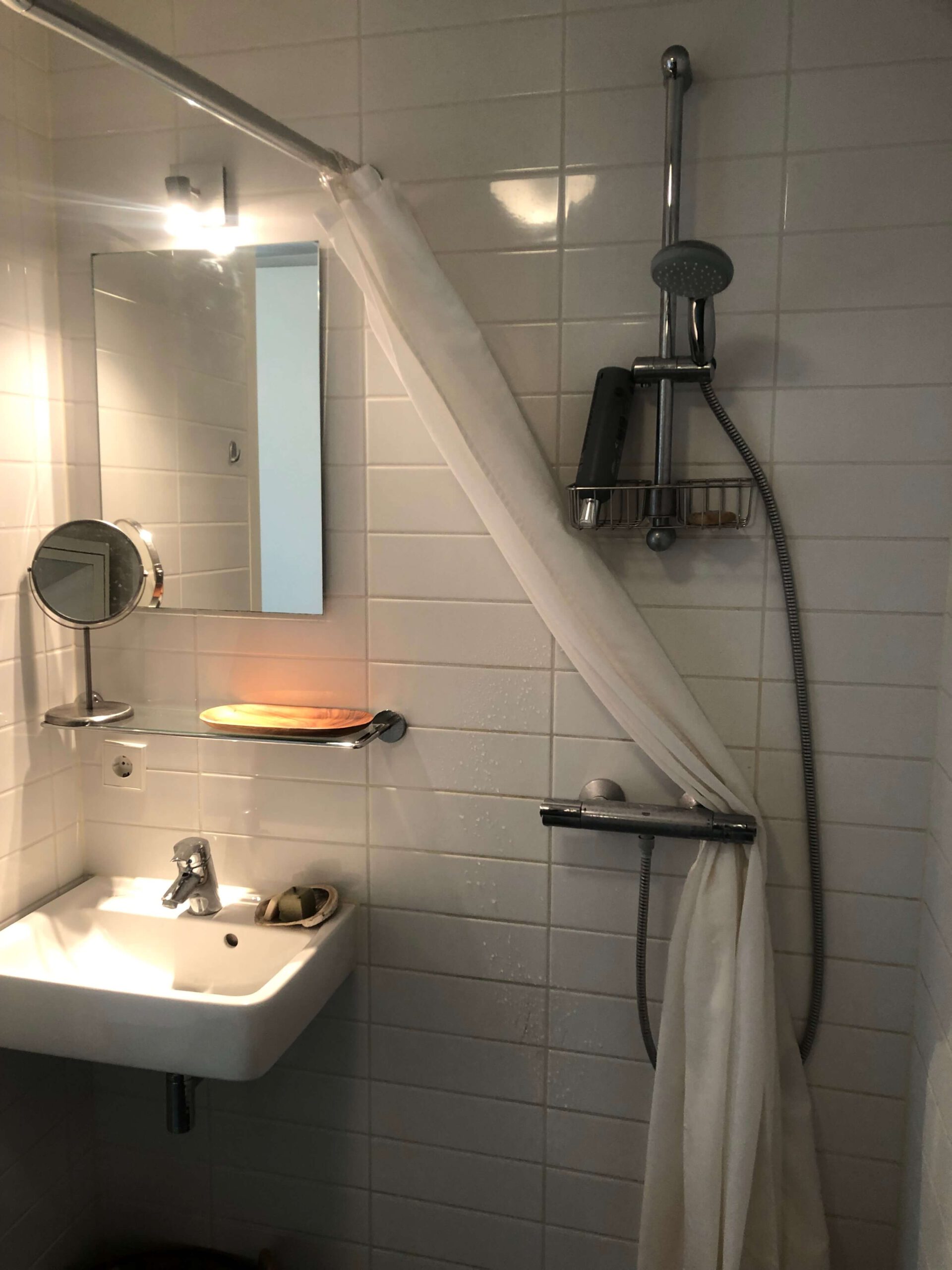 De badkamer heeft een inloopdouche, zwevend toilet en wastafel.