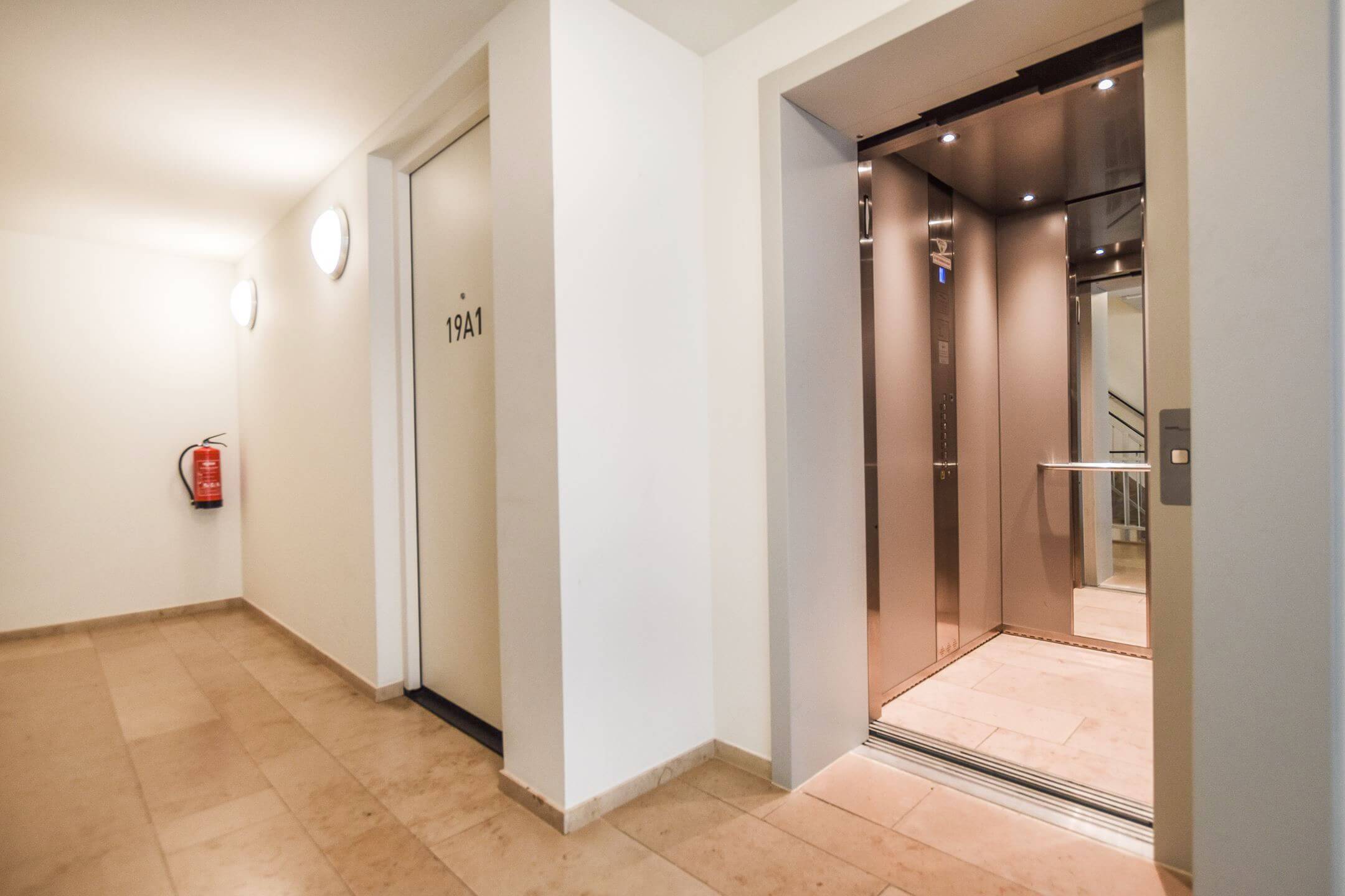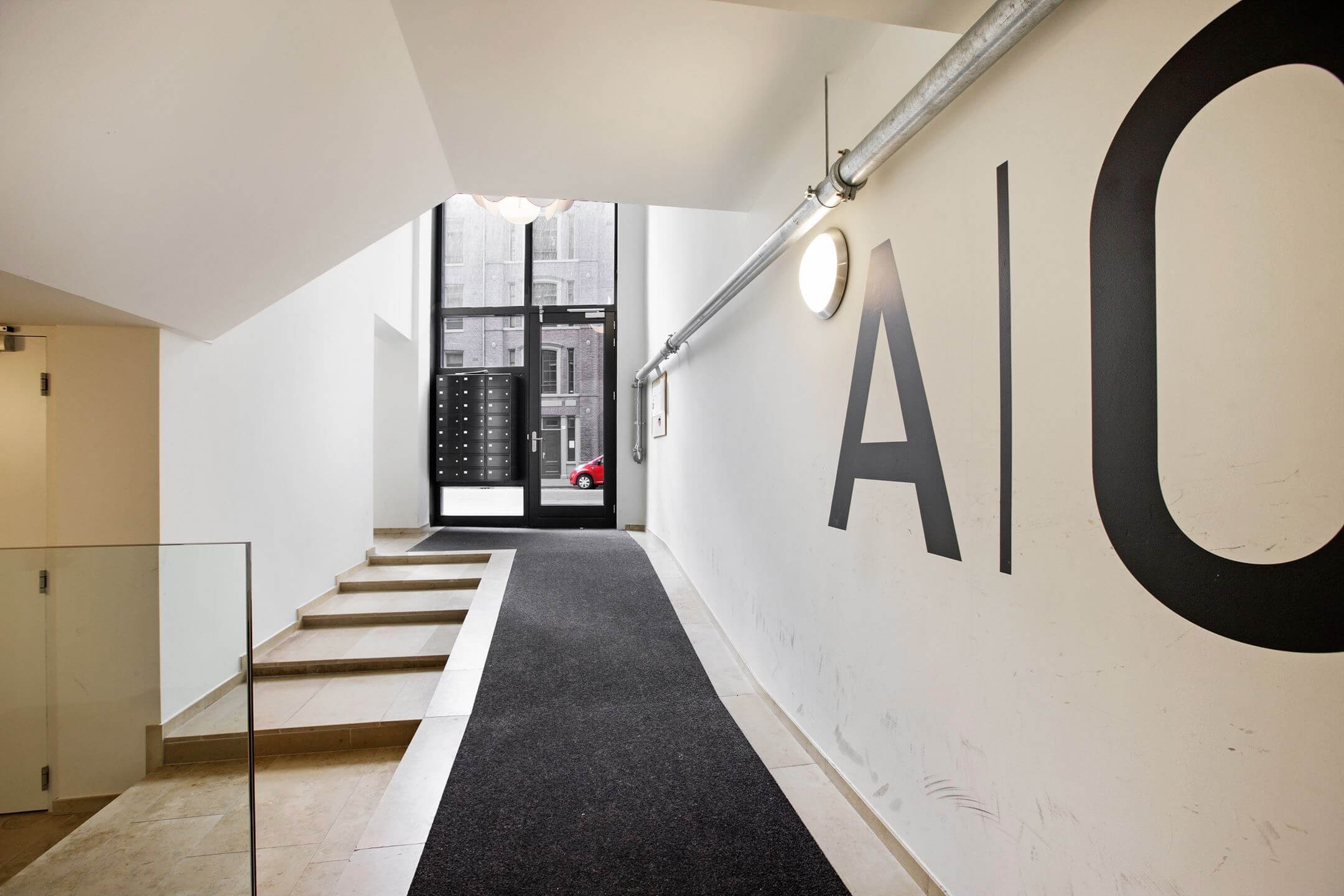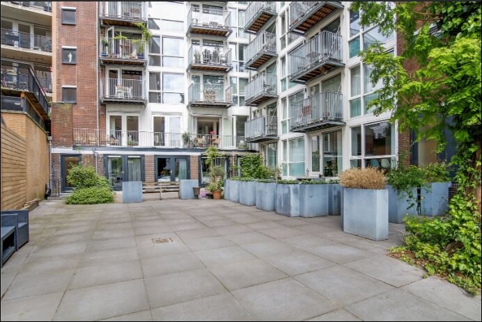 Het appartementen complex heeft een gemeenschappelijke ingang met intercom, gemeenschappelijke fietsberging en een gemeenschappelijke binnenplaats aan het water. Bij binnenkomst kunt u met de lift naar de 5e verdieping waar het appartement zich bevindt.