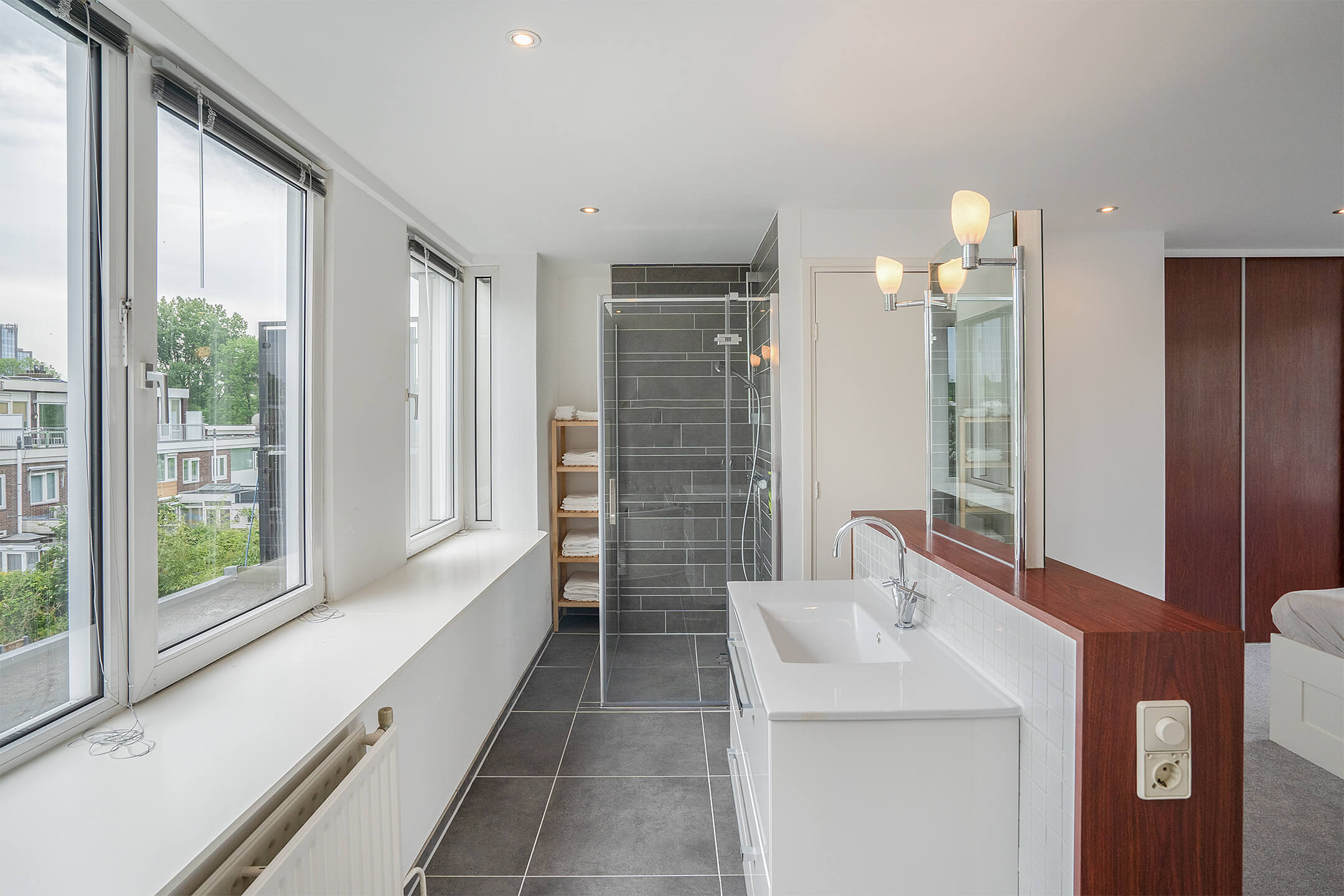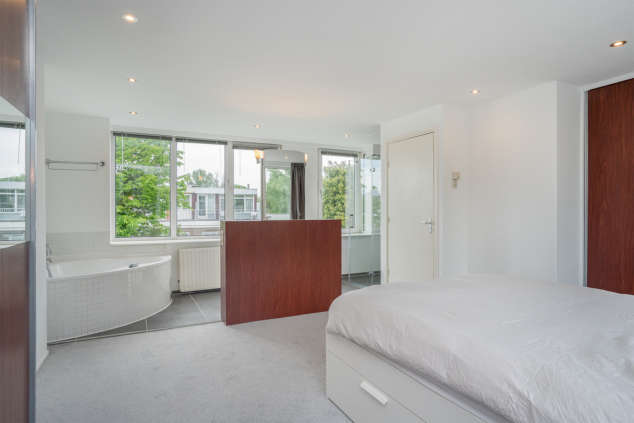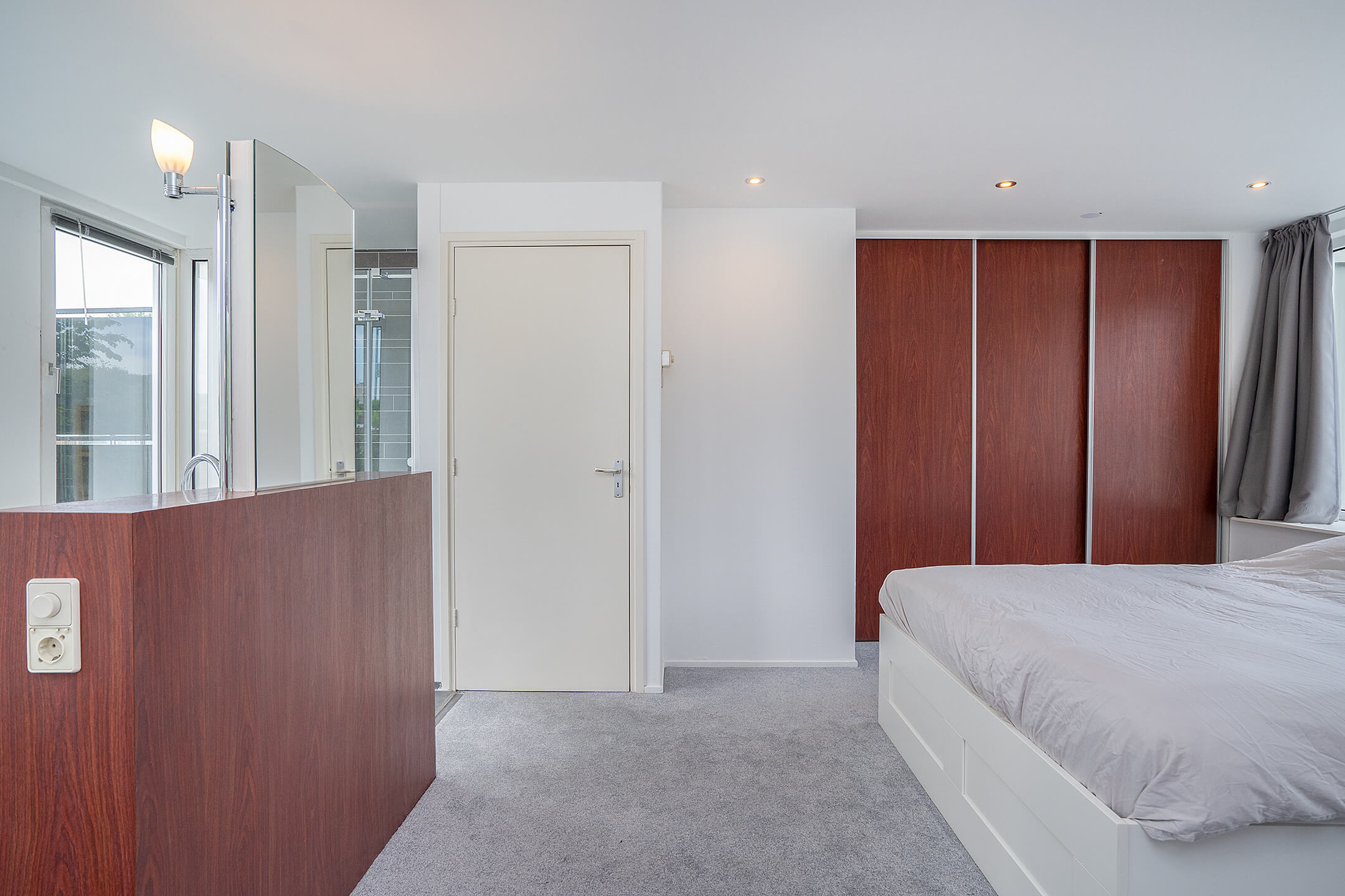 De bovenste verdieping is een royale slaapkamer met ensuite badkamer. De slaapkamer beschikt over 2 ruime inbouwkasten en heeft aan beide kanten ramen voorzien van luxaflex. De ensuite badkamer heeft een whirlpool, een aparte douchecabine en wastafelmeubel met spiegel.