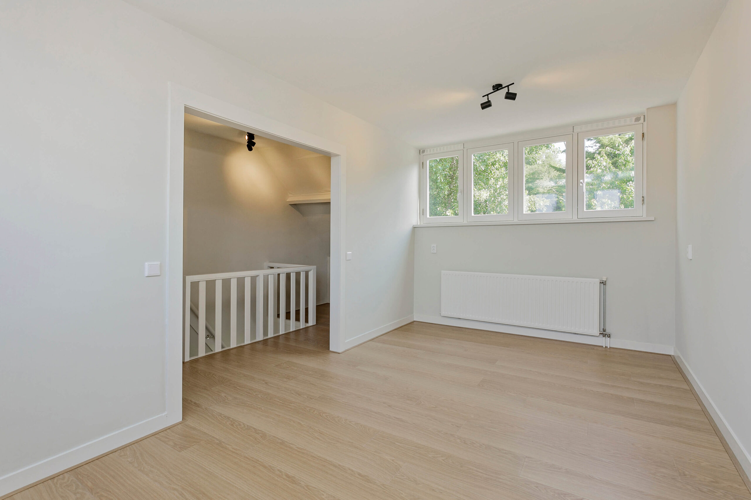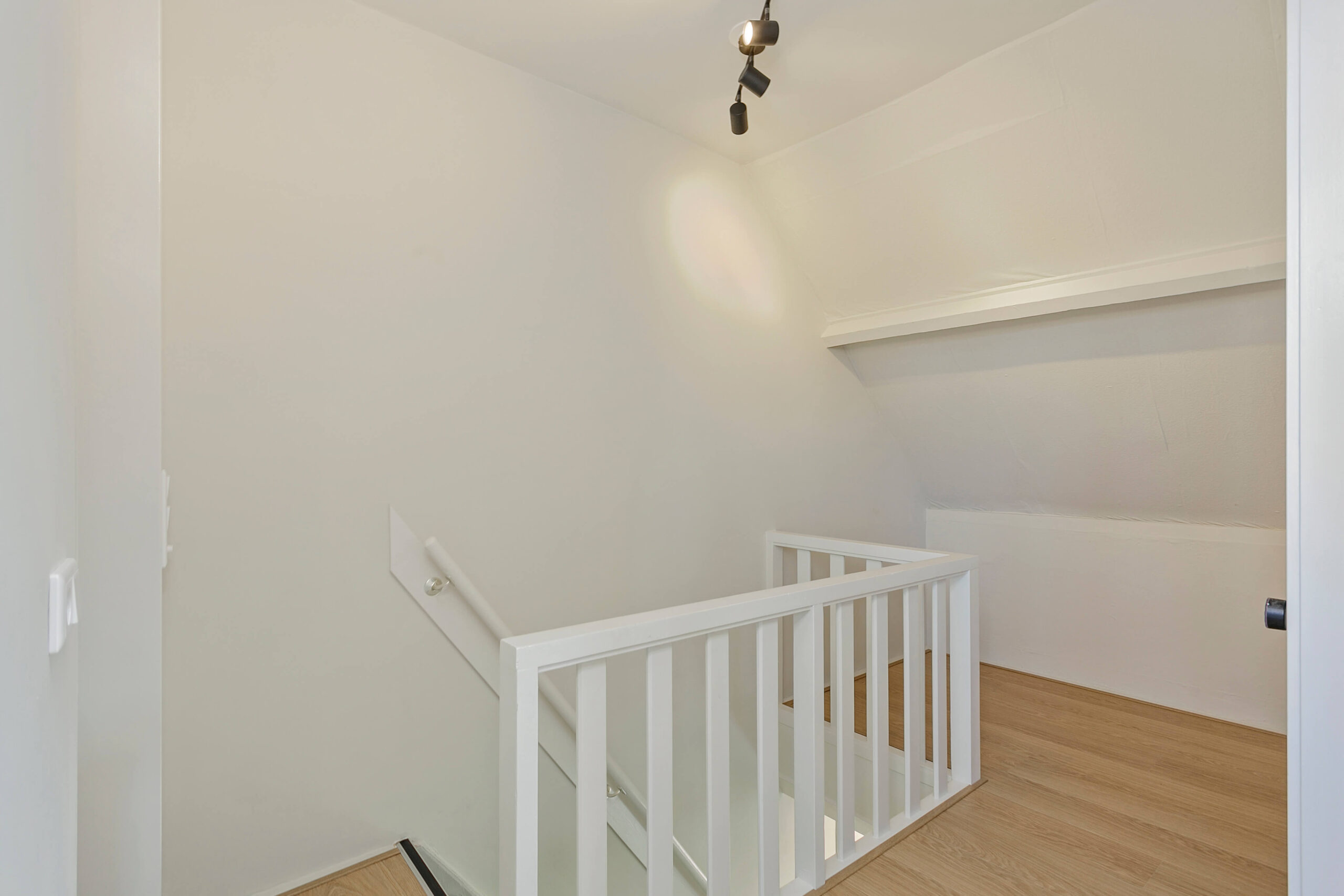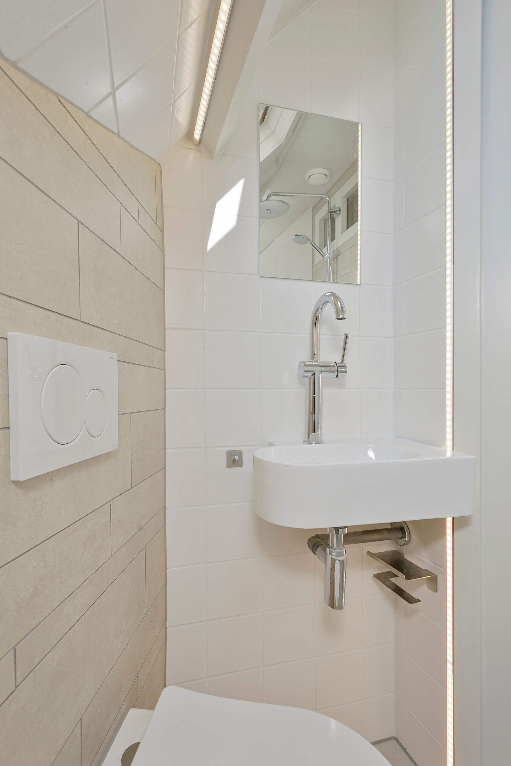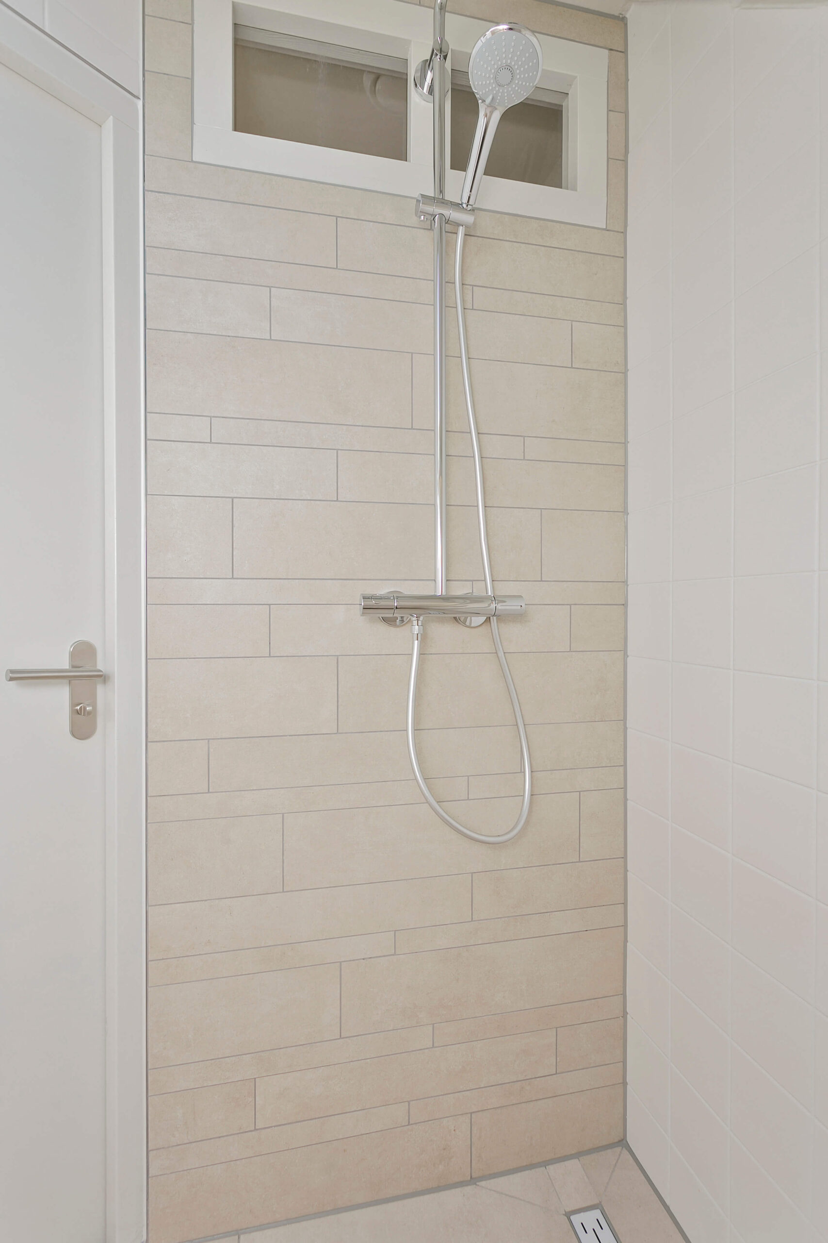 Op de eerste etage bevindt zich de slaapkamer en de badkamer. De ruime slaapkamer heeft voldoende ruimte voor een 2 persoonsbed en een garderobekast of een werkruimte. De slaapkamer heeft een beide zijde een raampartij waar veel licht door komt. Gordijnen zullen nog worden opgehangen. De badkamer is efficiënt ingedeeld met een zwevend toilet en een regendouche. Op de overloop is ook nog ruimte om het één en ander op te bergen en biedt een luik toegang tot de zolder waar ca. 3 m2 ruimte is voor spullen.
